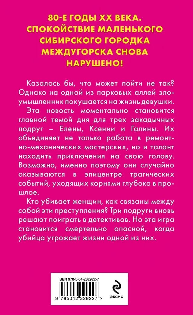 Казалось бы, что может пойти не так? Однако когда на одной из парковых аллей злоумышленник покушается на жизнь девушки, эта новость моментально становится главной темой дня для трех закадычных подруг — Елены, Ксении и Галины. Их объединяет не только работа в ремонтно-механических мастерских, но и талант находить приключения на свою голову. Возможно, именно поэтому они случайно оказываются в эпицентре трагических событий, уходящих корнями глубоко в прошлое.
