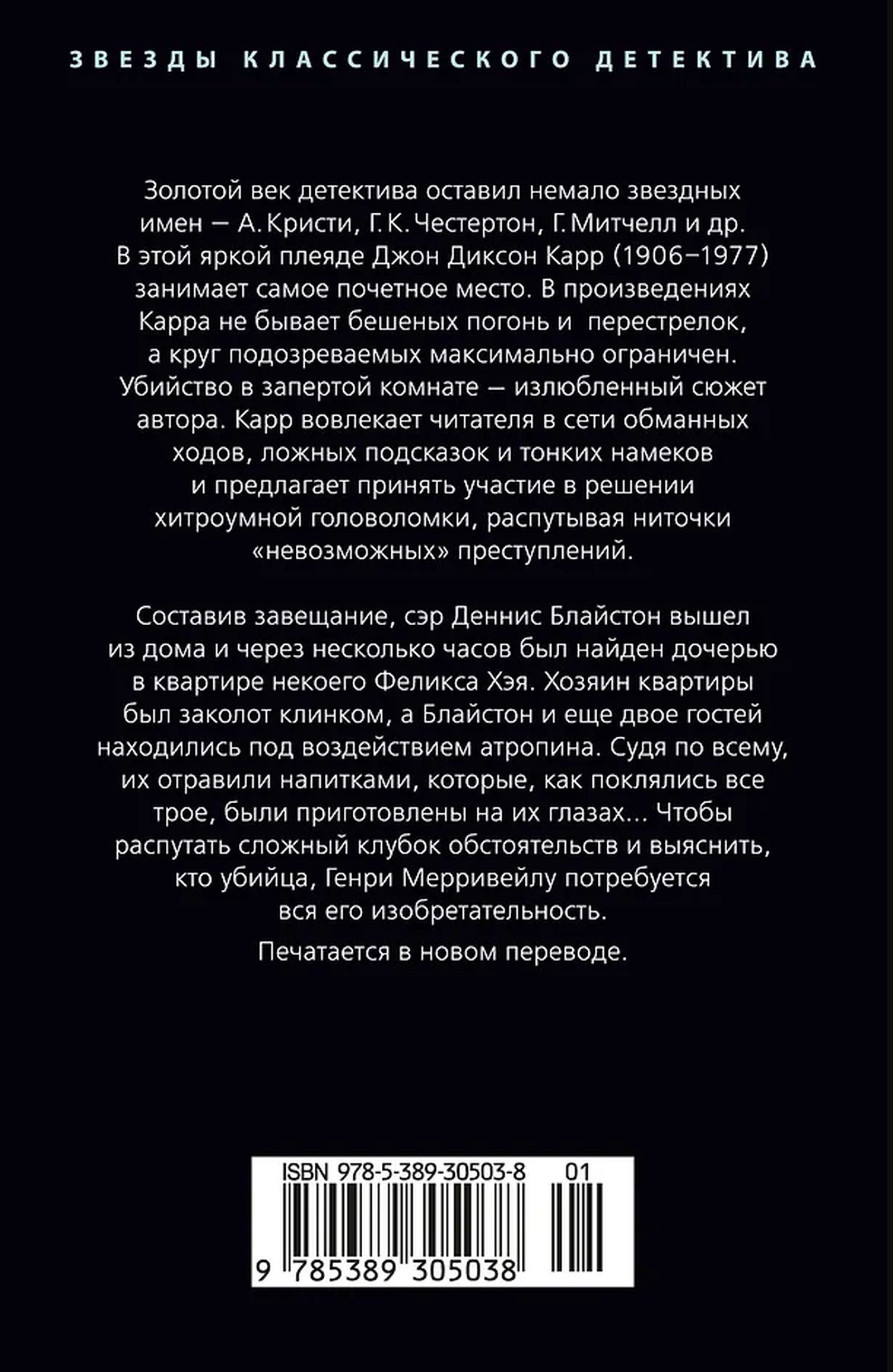 Золотой век детектива оставил немало звездных имен — А. Кристи, Г. К. Честертон, Г. Митчелл и др. В этой яркой плеяде Джон Диксон Карр (1906–1977) занимает самое почетное место. В произведениях Карра не бывает бешеных погонь и перестрелок, а круг подозреваемых максимально ограничен. Убийство в запертой комнате — излюбленный сюжет автора. Карр вовлекает читателя в сети обманных ходов, ложных подсказок и тонких намеков и предлагает принять участие в решении хитроумной головоломки, распутывая ниточки «невозможных» преступлений.