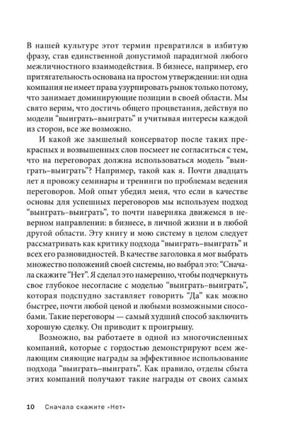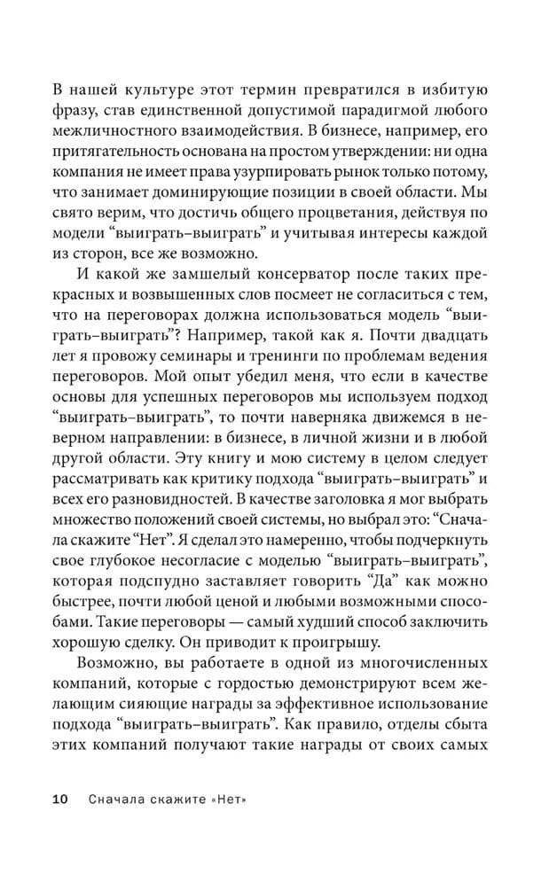 Если ваш клиент, угрожая разрывом отношений, вынуждает вас предоставить ему очередную скидку, а вы боитесь отказать и потерять его, то у Джима Кэмпа есть для вас другой, более эффективный способ ведения переговоров: Просто скажите «нет». Это короткое слово – самый эффективный инструмент в арсенале переговорных методик, позволяющий пресечь бесплодные дискуссии, отбросить ложные предположения и избежать ненужных компромиссов. Прочитав эту книгу, вы освоите уникальную систему подготовки, планирования и ведения переговоров. Вы узнаете: как перестать зависеть от результата переговоров, который вы не можете контролировать, и сконцентрироваться на том, чем вы можете управлять, – на собственном поведении; что и как следует говорить за столом переговоров: как вести оппонента с помощью правильно поставленных вопросов;  как противостоять сильному противнику, использующему давление и манипуляции.