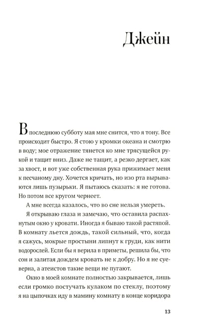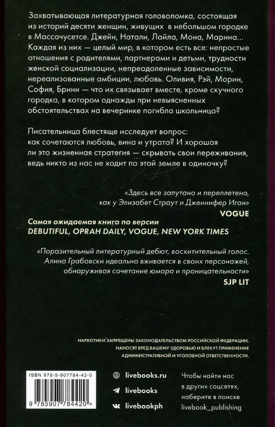 Захватывающая литературная головоломка, состоящая из историй десяти женщин, живущих в небольшом городке в Массачусетсе. Джейн, Натали, Лайла, Мона, Марина... Каждая из них — целый мир, в котором есть всё: непростые отношения с родителями, партнёрами и детьми, трудности женской социализации, непреодолённые зависимости, нереализованные амбиции, любовь. Оливия, Рэй, Морин, София, Бринн — что их связывает вместе, кроме скучного городка, в котором однажды при невыясненных обстоятельствах на вечеринке погибла школьница?