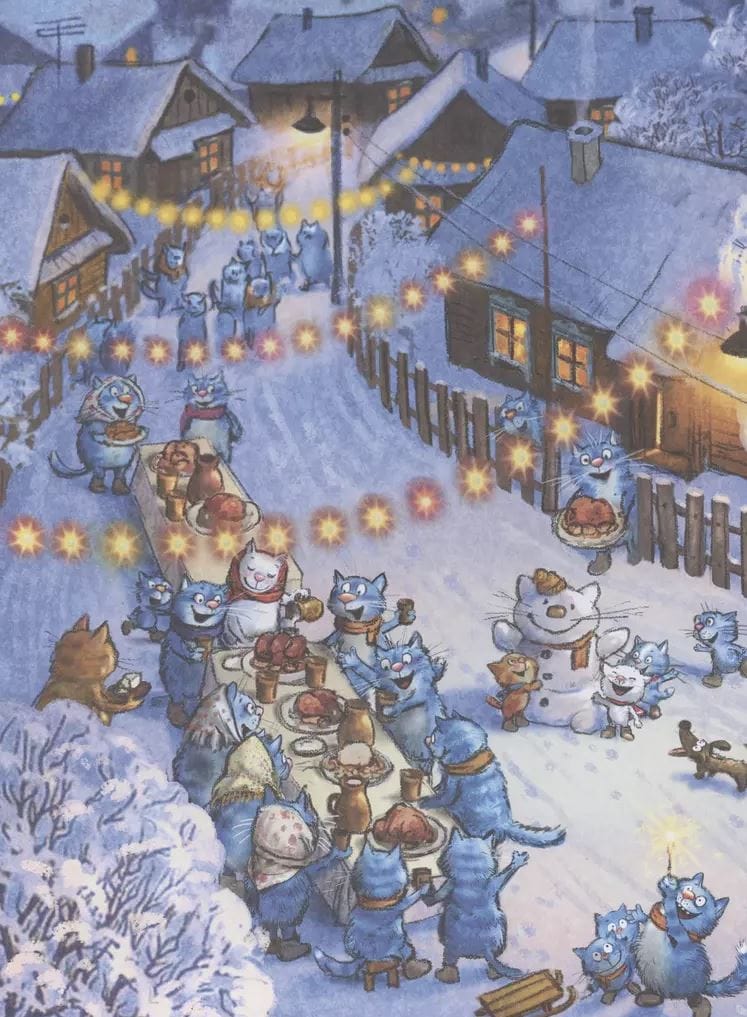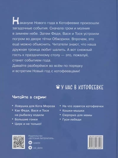 Накануне Нового года в Котофеевке произошли загадочные события. Сначала гром и молния в зимнем небе. Затем Федя, Вася и Тося устроили погром во дворе тётки Обжорихи. Впрочем, это ещё можно объяснить. Читатели знают, что наша дружная троица любит шалить. А вот снежный гость к праздничному столу — это, пожалуй, станет событием года. Давайте разберёмся во всём по порядку и встретим Новый год с котофеевцами!