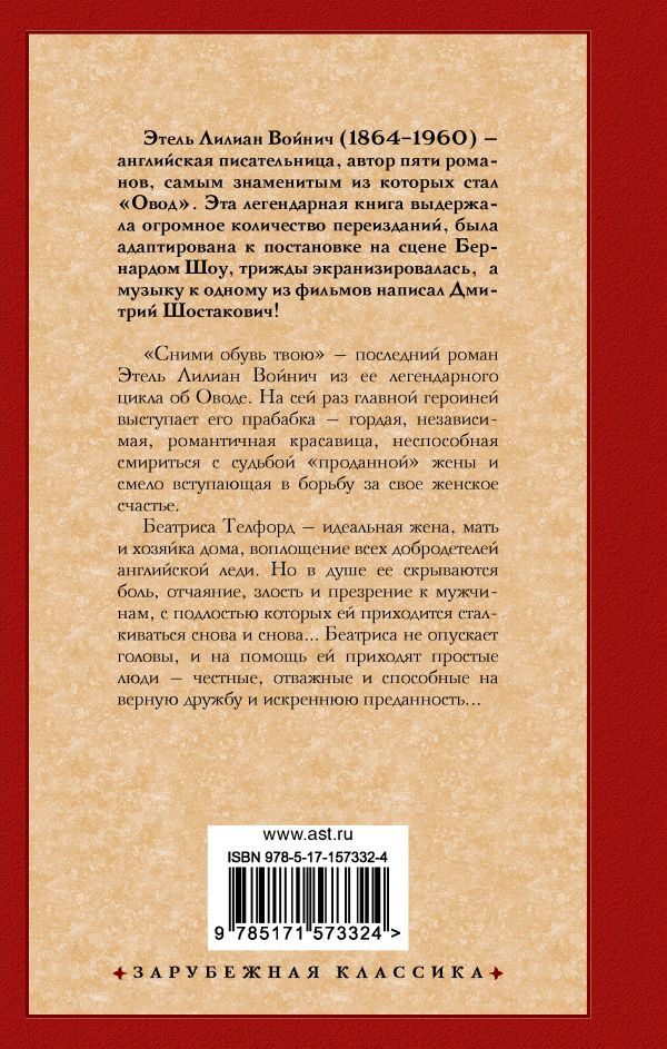 «Сними обувь твою» — последний роман Этель Лилиан Войнич из ее легендарного цикла об Оводе. На сей раз главной героиней выступает его прабабка — гордая, независимая, романтичная красавица, неспособная смириться с судьбой «проданной» жены и смело вступающая в борьбу за свое женское счастье.Беатриса Телфорд — идеальная жена, мать и хозяйка дома, воплощение всех добродетелей английской леди. Но в душе ее скрываются боль, отчаяние, злость и презрение к мужчинам, с подлостью которых ей приходится сталкиваться снова и снова… Беатриса не опускает головы, и на помощь ей приходят простые люди — честные, отважные и способные на верную дружбу и искреннюю преданность...