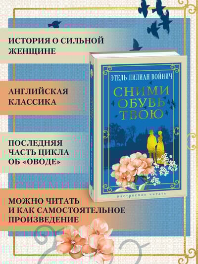 Английская писательница Этель Лилиан Войнич обрела всемирную известность после публикации романа «Овод». К судьбе своего героя Войнич возвращается через тринадцать лет в романе «Прерванная дружба». А спустя несколько десятилетий выходит последний роман из прославленного цикла об Оводе — «Сними обувь твою» (1945). В центре этого произведения — Беатриса Телфорд, прабабка легендарного героя, сильная, умная, смелая женщина, прошедшая через множество испытаний, готовая противостоять всему миру и отдать жизнь во имя любви и своих убеждений.