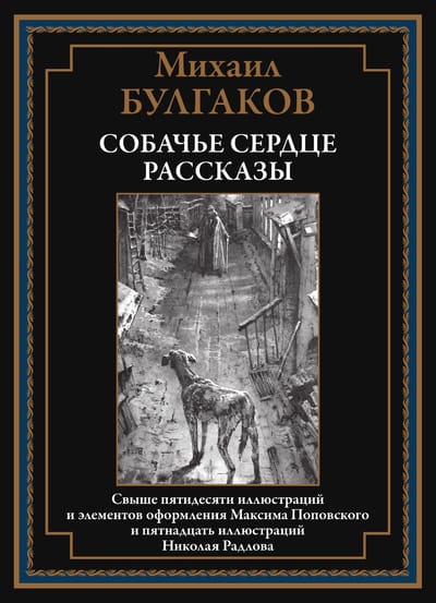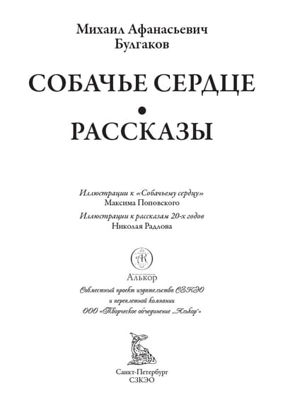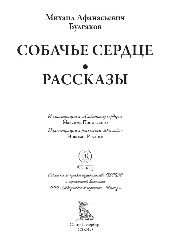 Михаил Афанасьевич Булгаков (1891–1940) начал писать повесть «Собачье сердце» в 1925 году, вскоре после регистрации своего брака с недавно вернувшейся в Россию Любовью Евгеньевной Белозерской. Повесть содержала множество критических выпадов против ситуации, сложившейся в Советской России после революции, поэтому при жизни Булгакова она так и не была напечатана. К. М. Симонов, в течение многих лет бывший председателем Комиссии по литературному наследию писателя и много сделавший для публикации его произведений, отмечал в 1967 году по поводу «Собачьего сердца»: «Это вещь сложная, трудная для публикации даже сейчас». Впервые повесть напечатали заграницей. В 1968 году «Собачье сердце» вышло в Лондоне. Текст был опубликован издательством Flegon press в 9-м и 10-м номерах журнала «Студент. Журнал авангарда советской литературы». В том же году повесть вышла во Франкфурте-на-Майне. Она была напечатана издательством «Посев» в 69-м номере «Журнала литературы, искусства, науки и общественно-политической мысли «Грани»». Обе эти публикации появились без ведома вдовы писателя. Опубликованные тексты значительно отклонялись от принадлежавшего ей оригинала. Первое советское издание «Собачьего сердца» вышло лишь в 1987 году. Текст, подготовленный для публикации литературоведом М. О. Чудаковой появился в 6-м номере журнала «Знамя», однако и он содержал тысячи искажений. Наконец в 1989 году в киевском издательстве «Днепр» вышел подготовленный литературоведом Л. М. Яновской двухтомник сочинений Булгакова, в котором текст «Собачьего сердца» был напечатан по оригиналу — последней выправленной автором машинописи. Этот неискаженный булгаковский текст и напечатан в этой книге. Динамичные сцены «Собачьего сердца» в этом издании украшают иллюстрации талантливого современного художника Максима Поповского. Рассказы же Булгакова сопровождают в этой книге рисунки Николая Эрнестовича Радлова (1889–1942). Будущий художник появился на свет в 1889 году в семье членкора Академии Наук и директора Публичной библиотеки Эрнеста Львовича Радлова. Рисовать Николай начал еще в школе. Учась на историко-филологическом факультете Петербургского университета, Радлов успевал посещать занятия в Академии художеств. Он мог бы стать художником-академистом, однако выбрал стезю карикатуриста. Радлов обладал удивительным талантом изображать короткие истории в виде серии последовательных сценок. В 1937 году вышел его сборник «Рассказы в картинках» со смешными рисованными историями для детей. Эта книжка имела фантастический успех, была переведена на английский и получила премию на Международном конкурсе детской книги в США.