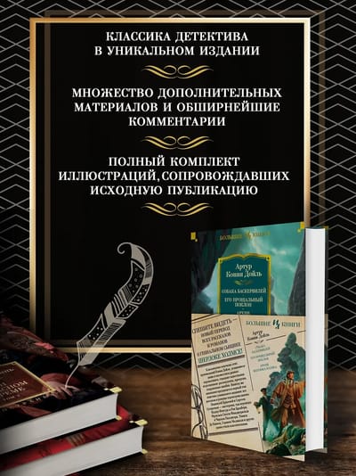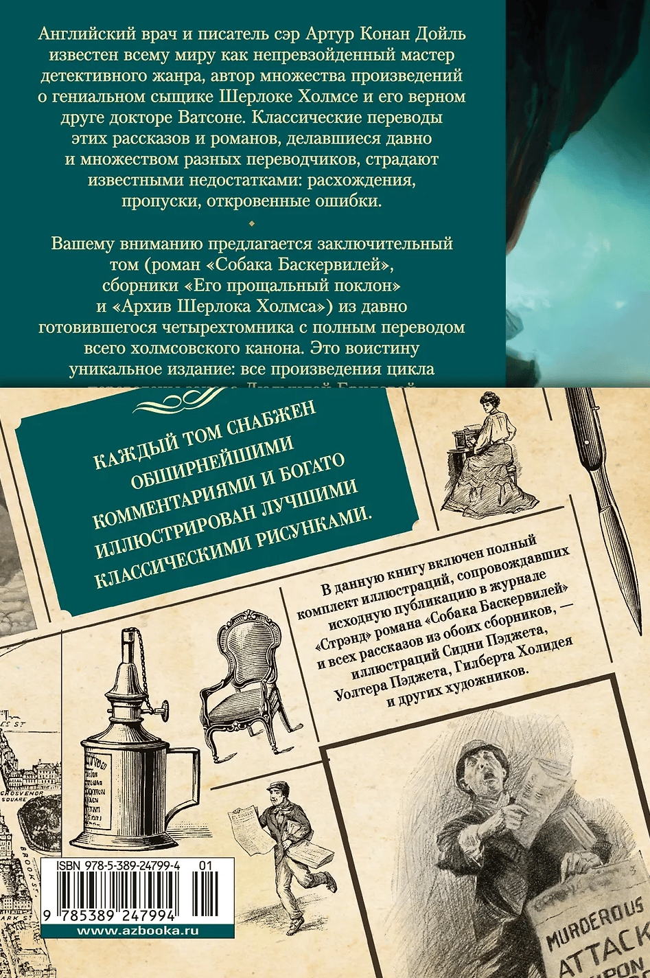 Английский врач и писатель сэр Артур Конан Дойль известен всему миру как непревзойдённый мастер детективного жанра, автор множества произведений о гениальном сыщике Шерлоке Холмсе и его верном друге докторе Ватсоне. Классические переводы этих рассказов и романов, делавшиеся давно и множеством разных переводчиков, страдают известными недостатками: расхождения, пропуски, откровенные ошибки. Вашему вниманию предлагается заключительный том (роман «Собака Баскервилей», сборники «Его прощальный поклон» и «Архив Шерлока Холмса») из давно готовившегося четырёхтомника с полным переводом всего холмсовского канона. Это воистину уникальное издание: все произведения цикла переведены заново Людмилой Бриловой и Сергеем Сухаревым — мастерами, чьи переводы Кадзуо Исигуро и Рэя Брэдбери, Фрэнсиса Скотта Фицджеральда и Чарльза Паллисера, Томаса Де Квинси, Германа Мелвилла и других давно стали классическими. При этом в каждый том включено множество дополнительных материалов: предисловия к ранним публикациям, воспоминания Конан Дойля, касающиеся тех или иных произведений, некоторые интервью писателя. Плюс каждый том снабжён обширнейшими комментариями и богато иллюстрирован лучшими классическими рисунками. В данную книгу включён полный комплект иллюстраций, сопровождавших исходную публикацию в журнале «Стрэнд» романа «Собака Баскервилей» и всех рассказов из обоих сборников — иллюстраций Сидни Пэджета, Уолтера Пэджета, Гилберта Холидея и других художников.