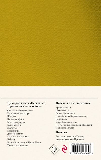 Цикл рассказов «Несколько торопливых слов любви»: Область слепящего света, На долгом светофоре, Шарфик, В прямом эфире, Мастер-тарабука, Голос в метро, Заклятье, Бессонница, Двое на крыше, «И когда она упала…», Гобелен, Волшебные сказки Шарля Перро, Такая долгая жизнь