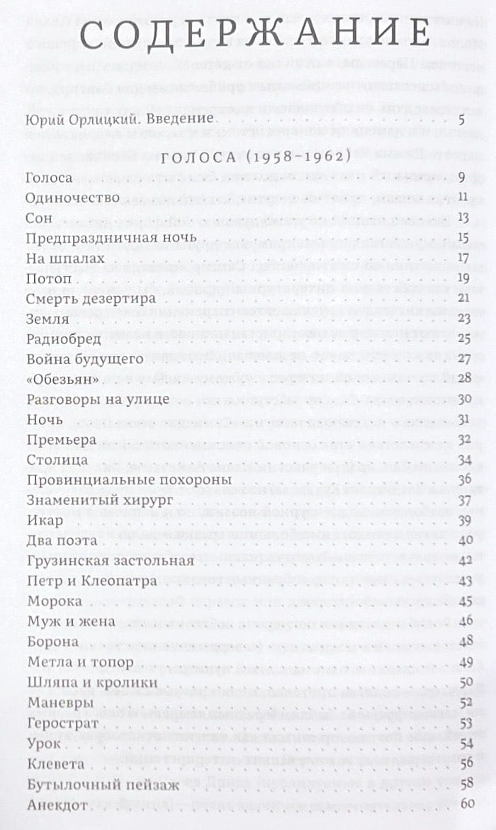 Новое собрание сочинений Генриха Сапгира — попытка не просто собрать вместе большую часть написанного замечательным русским поэтом и прозаиком второй половины ХX века, но и создать некоторый интегральный образ этого уникального (даже для данного периода нашей словесности) универсального литератора. Он не только с равным удовольствием писал для взрослых и для детей, но и словно воплощал в слове ларионовско-гончаровскую концепцию «всёчества»: соединения всех известных до этого идей, манер и техник современного письма, одновременно радикально авангардных и предельно укорененных в самой глубинной национальной традиции и ведущего постоянный провокативный диалог с нею. В первый том собрания «Голоса» вошли разножанровые произведения Генриха Сапгира, объединенные идеей диалога — с поэтами-предшественниками и современниками, с социальными языковыми моделями и метафизическими силами. Сапгир выступает то как собеседник-оппонент, то как транслятор чужих языков, то как художник-исследователь человеческого (и нечеловеческого) многоголосья.