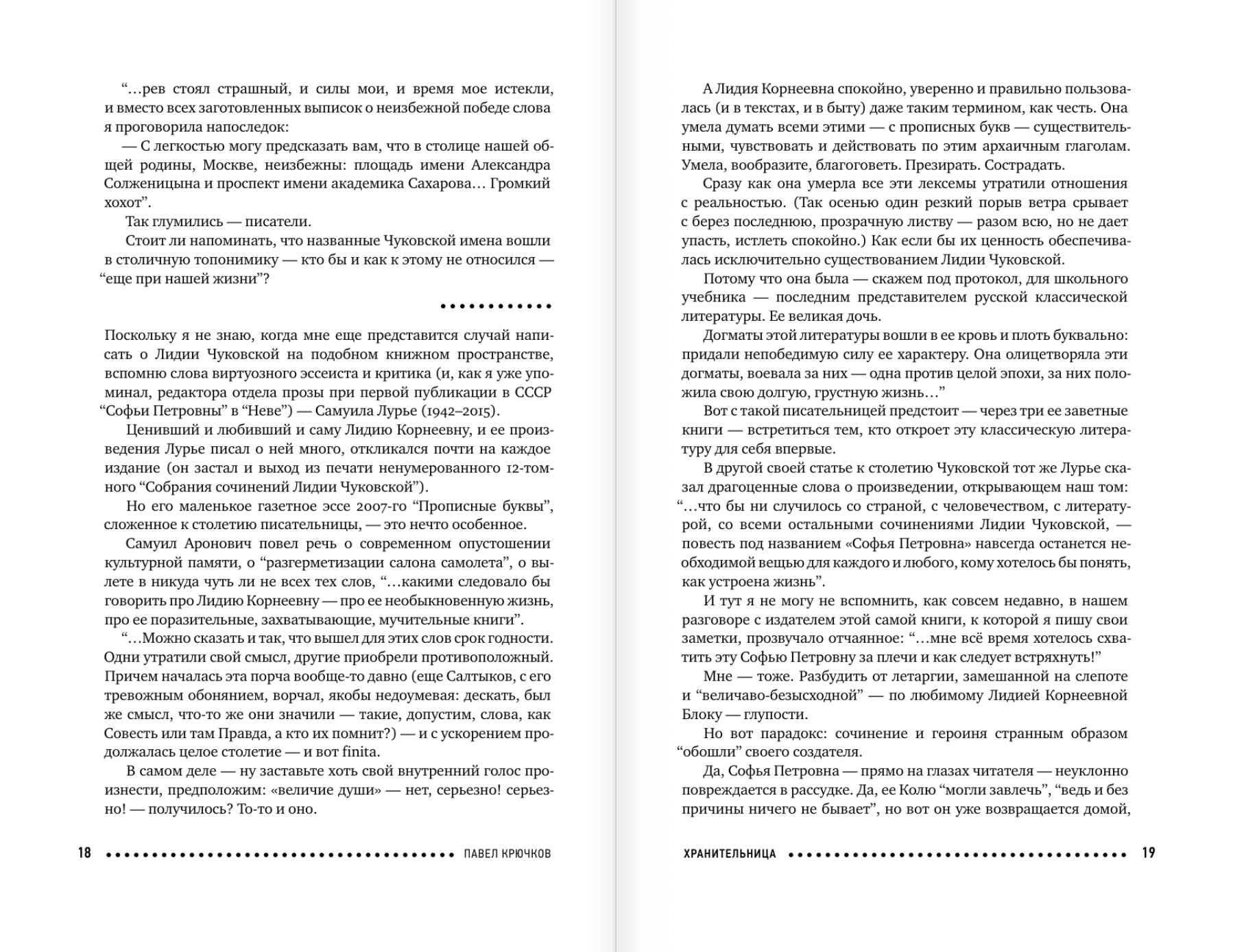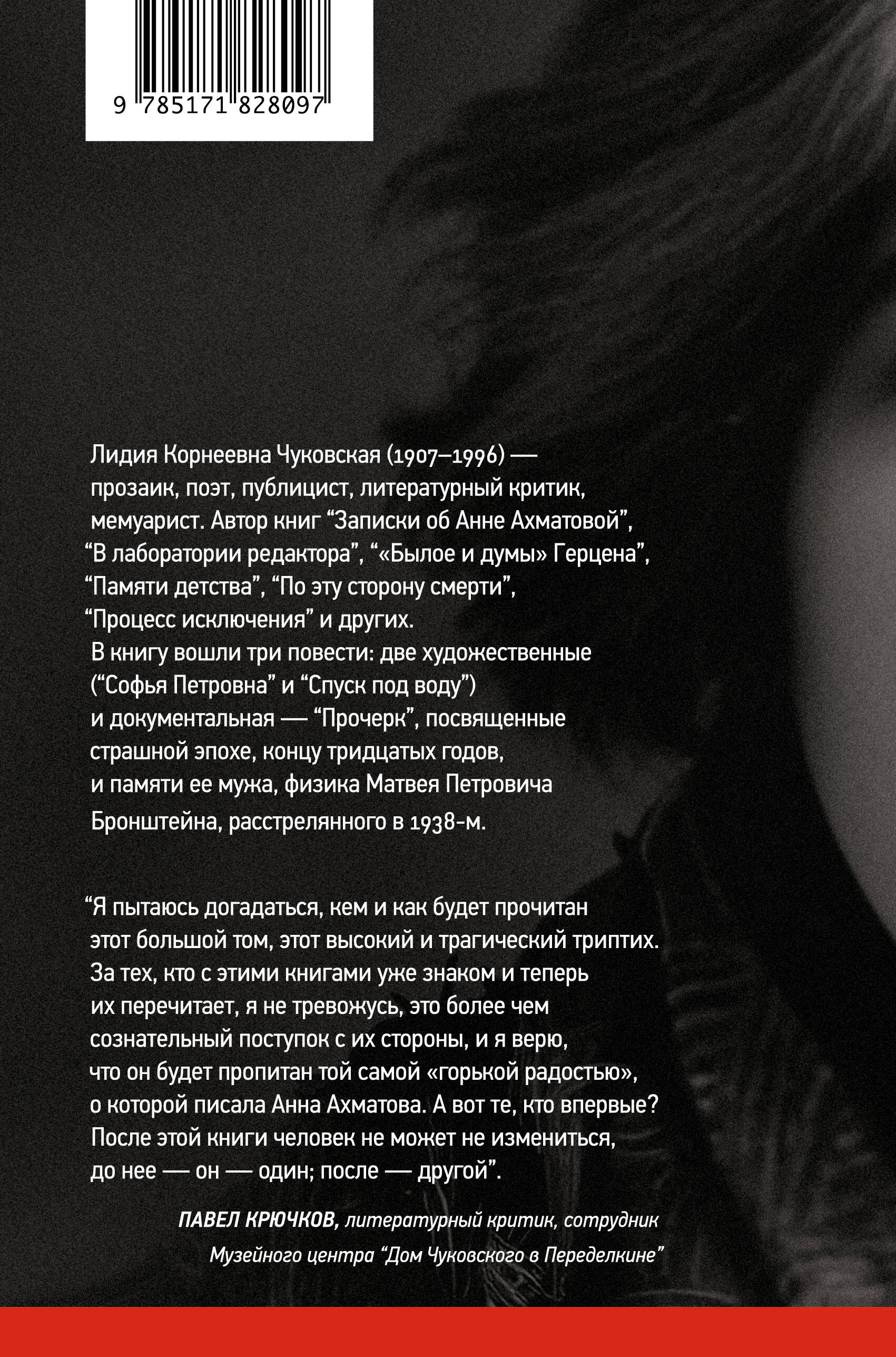 В это издание вошли три заветные книги Лидии Чуковской. Две — художественные и одна — документальная. Самый факт написания первой из них — на границе 1939 и 1940 годов — кажется настоящим чудом. Эти повести словно бы «вырастают» одна из другой и «прорастают» друг в друга: перед нами — своего рода шкатулка с тройным дном, высокий и трагический триптих, симфония классической прозы. Перечитывая «Софью Петровну», «Спуск под воду» и неоконченный «Прочерк», — я не могу не думать о том, какого единственного писателя-собеседника может обрести иной неравнодушный читатель. Павел Крючков, литературный критик.