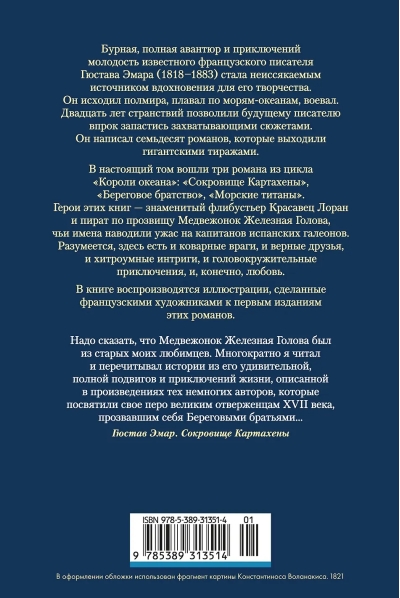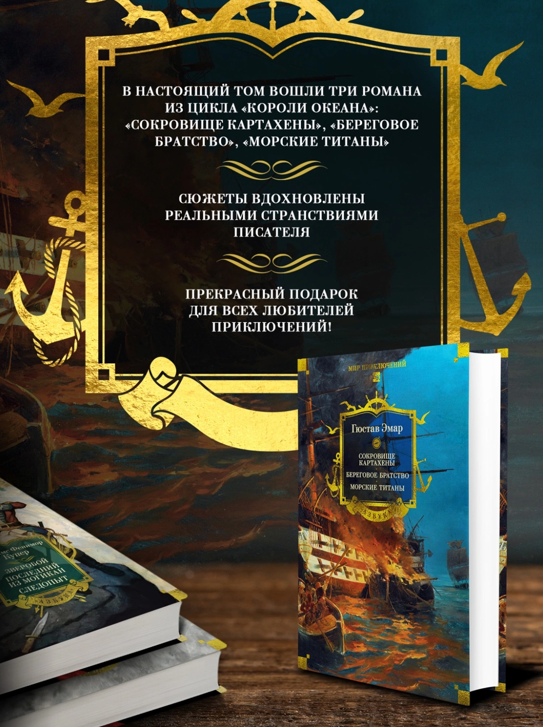 В настоящий том вошли три романа из цикла «Короли океана»: «Сокровище Картахены», «Береговое братство», «Морские титаны». Герои этих книг — знаменитый флибустьер Красавец Лоран и пират по прозвищу Медвежонок Железная Голова, чьи имена наводили ужас на капитанов испанских галеонов. Разумеется, здесь есть и коварные враги, и верные друзья, и хитроумные интриги, и головокружительные приключения, и, конечно, любовь.