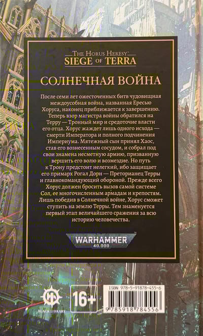 После семи лет ожесточенных битв чудовищная междоусобная война, названная Ересью Хоруса, наконец приближается к завершению. Теперь взор магистра войны обратился на Терру - Тронный мир и средоточие власти его отца. Хорус жаждет лишь одного исхода - смерти Императора и полного подчинения Империума. Мятежный сын принял Хаос, став его вознесенным сосудом, и собрал под свои знамена несметную армию, призванную вершить его волю и возмездие. Но путь к Трону предстоит нелегкий, ибо защищает его примарх Рогал Дорн - Преторианец Терры и главнокомандующий обороной. Прежде всего Хорус должен бросить вызов самой системе Сол, ее многочисленным армадам и крепостям. Лишь победив в Солнечной войне, Хорус сможет ступить на землю Терры. Тем знаменуется первый этап величайшего сражения за всю историю человечества.