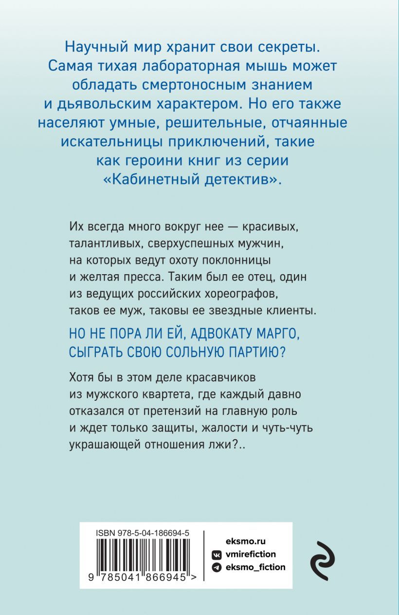 Их всегда много вокруг нее — красивых, талантливых, сверхуспешных мужчин, на которых ведут охоту поклонницы и желтая пресса. Таким был ее отец, один из ведущих российских хореографов, таков ее муж, таковы ее звездные клиенты. Но не пора ли и ей, адвокату Марго, сыграть свою сольную партию? Хотя бы в этом деле красавчиков из мужского квартета, где каждый давно отказался от претензий на главную роль и ждет только защиты, жалости и чуть-чуть украшающей отношения лжи?..