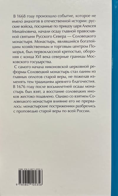 Книга петербургского писателя, философа и историка Кирилла Кожурина посвящена одному из центральных моментов русской политической и церковной истории - восстанию иноков Соловецкого монастыря, которые отказались принять церковную реформу, предпринятую патриархом Никоном и царем Алексеем Михайловичем в середине XVII века, и в течение восьми лет выдерживали осаду царскими войсками. Книга, основанная на подлинных исторических документах и на трудах предшественников, повествует как о ходе самого восстания, так и о его предыстории и многообразных последствиях.