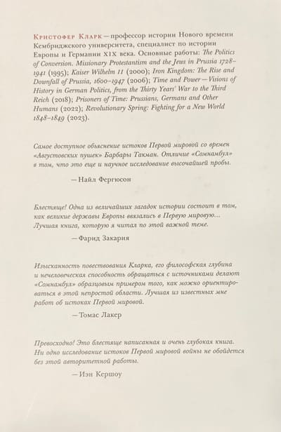 Опираясь на новейшие исследования, историк Кристофер Кларк предлагает свежий взгляд на Первую мировую войну, сосредотачивая внимание не на полях сражений и кровопролитии, а на сложных событиях и отношениях, которые привели группу благонамеренных лидеров к жестокому конфликту. Кларк прослеживает путь к войне, подробно рассматривая, как принимались ключевые решения в Вене, Берлине, Санкт-Петербурге, Париже, Лондоне и Белграде, и обращается к предшествующей истории, приведшей к событиям 1914 года, взаимному непониманию и непреднамеренным сигналам, всего за несколько недель вызвавшим полномасштабный кризис.