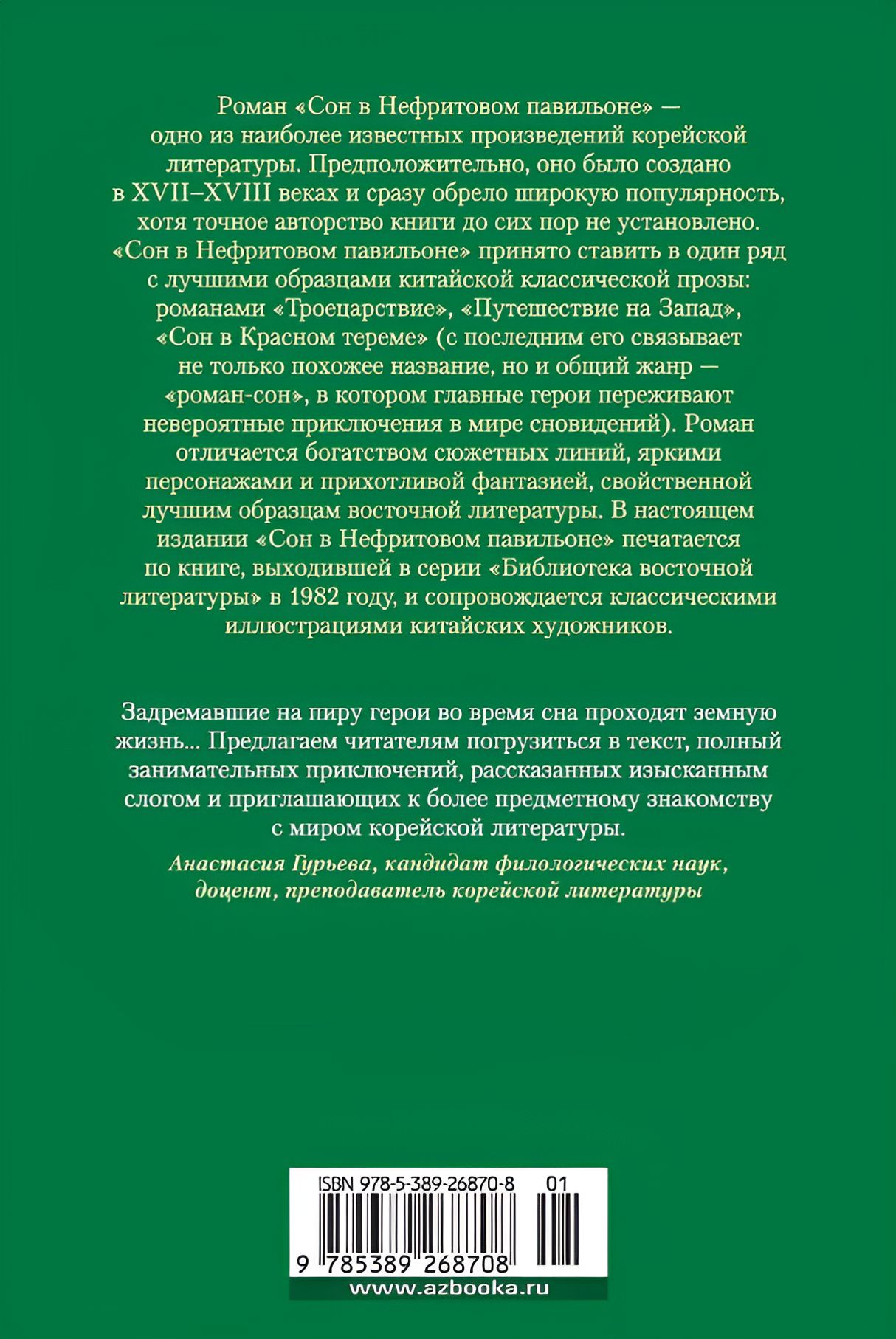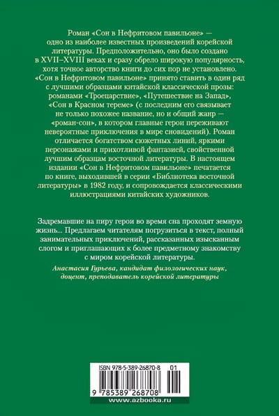 Роман «Сон в Нефритовом павильоне» — одно из наиболее известных произведений корейской литературы. Предположительно, оно было создано в XVII–XVIII веках и сразу обрело широкую популярность, хотя точное авторство книги до сих пор не установлено. «Сон в Нефритовом павильоне» принято ставить в один ряд с лучшими образцами китайской классической прозы: романами «Троецарствие», «Путешествие на Запад», «Сон в Красном тереме» (с последним его связывает не только похожее название, но и общий жанр — «роман-сон», в котором главные герои переживают невероятные приключения в мире сновидений).