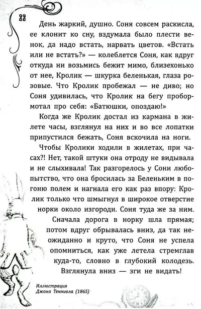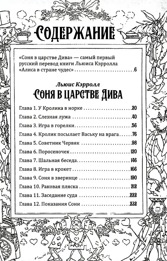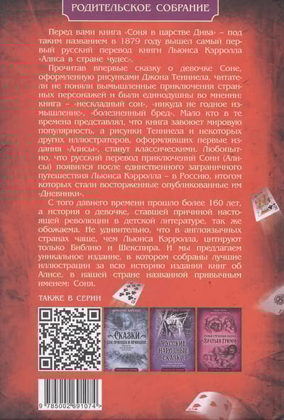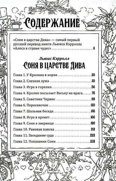Перед вами книга «Соня в царстве Дива» — под таким названием в 1879 году вышел самый первый русский перевод книги Льюиса Кэрролла «Алиса в стране чудес». Прочитав впервые сказку о девочке Соне, оформленную рисунками Джона Тенниела, читатели не поняли вымышленные приключения странных персонажей и были единодушны во мнении: книга — «нескладный сон», «никуда не годное измышление», «болезненный бред». Мало кто в те времена представлял, что книга завоюет мировую популярность, а рисунки Тенниела и некоторых других иллюстраторов, оформлявших первые издания «Алисы», станут классическими. Любопытно, что русский перевод приключений Сони (Алисы) появился после единственного заграничного путешествия Льюиса Кэрролла — в Россию, итогом которых стали восторженные опубликованные им «Дневники». С того давнего времени прошло более 160 лет, а история о девочке, ставшей причиной настоящей революции в детской литературе, так же обожаема. Не удивительно, что в англоязычных странах чаще, чем Льюиса Кэрролла, цитируют только Библию и Шекспира. И мы предлагаем уникальное издание, в котором собраны лучшие иллюстрации за всю историю издания книг об Алисе, в нашей стране названной привычным именем: Соня.