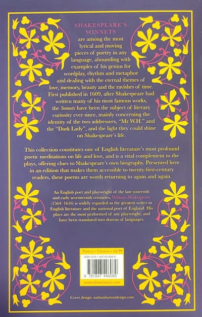 Shakespeare's Sonnets are among the most lyrical and moving pieces of poetry in any language, abounding with examples of his genius for wordplay, rhythm and metaphor and dealing with the eternal themes of love, memory, beauty and the ravishes of time. First published in 1609, after Shakespeare had written many of his most famous works, the Sonnets have been the subject of literary curiosity ever since, mainly concerning the identity of the two addressees, 'Mr W.H.' and the 'Dark Lady', and the light they could shine on Shakespeare's life.