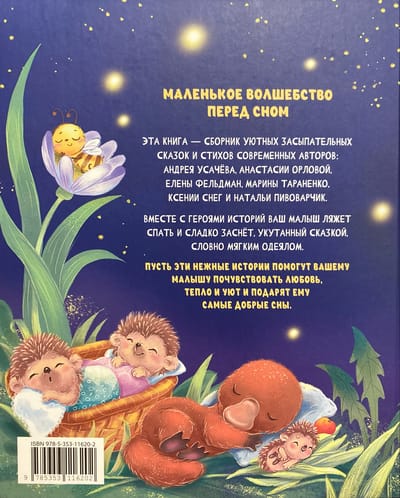 Эта книга - сборник уютных засыпательных сказок и стихов современных авторов: Андрея Усачёва, Анастасии Орловой, Елены Фельдман, Марины Тараненко, Ксении Снег и Натальи Пивоварчик. Вместе с героями историй ваш малыш ляжет спать и сладко заснёт, укутанный сказкой, словно мягким одеялом.
