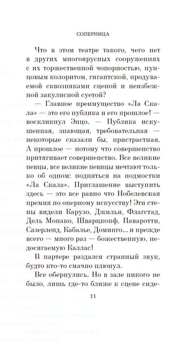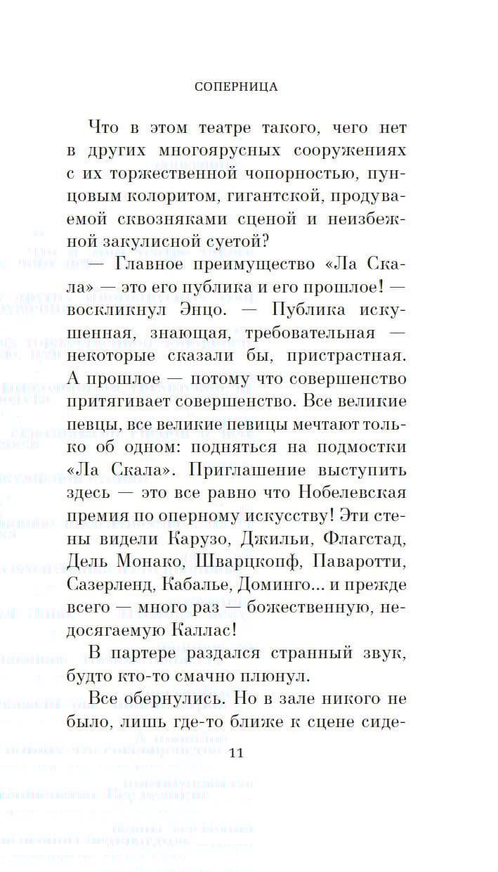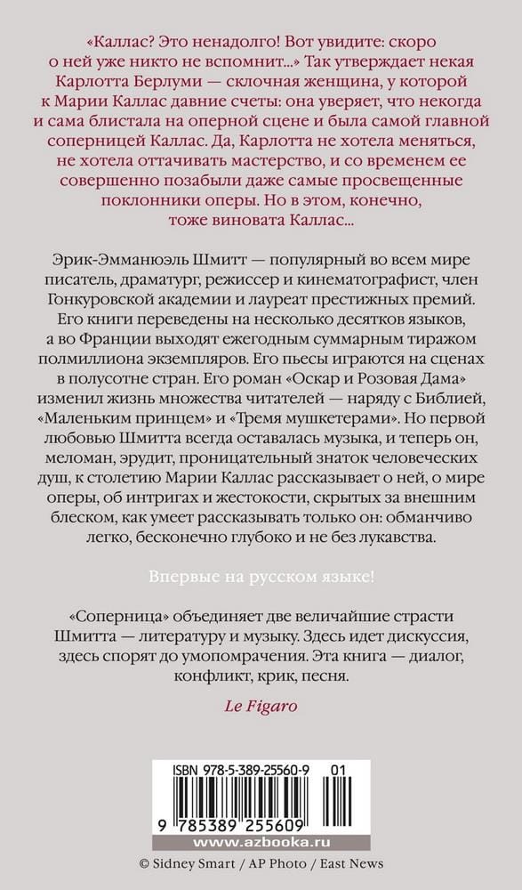 Однако «Соперница» — совсем другая история: миф наизнанку, взгляд из зазеркалья, антипортрет глазами женщины, которая Марию Каллас ненавидит, и эту историю о ней, о мире оперы, об интригах и жестокости, скрытых за внешним блеском, Шмитт рассказывает, как умеет только он: обманчиво легко, бесконечно глубоко и не без лукавства.