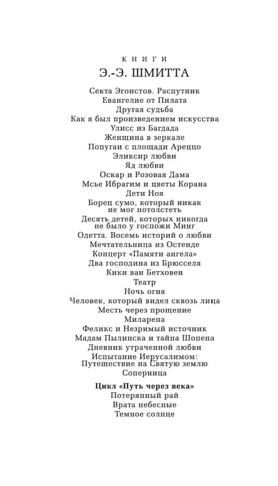 Эрик-Эмманюэль Шмитт — популярный во всем мире писатель, драматург, режиссер и кинематографист, член Гонкуровской академии и лауреат престижных премий. Его книги переведены на несколько десятков языков, а во Франции выходят ежегодным суммарным тиражом полмиллиона экземпляров, его пьесы играются на сцене в полусотне стран. Его роман «Оскар и Розовая Дама» изменил жизнь множества читателей — наряду с Библией, «Маленьким принцем» и «Тремя мушкетерами».