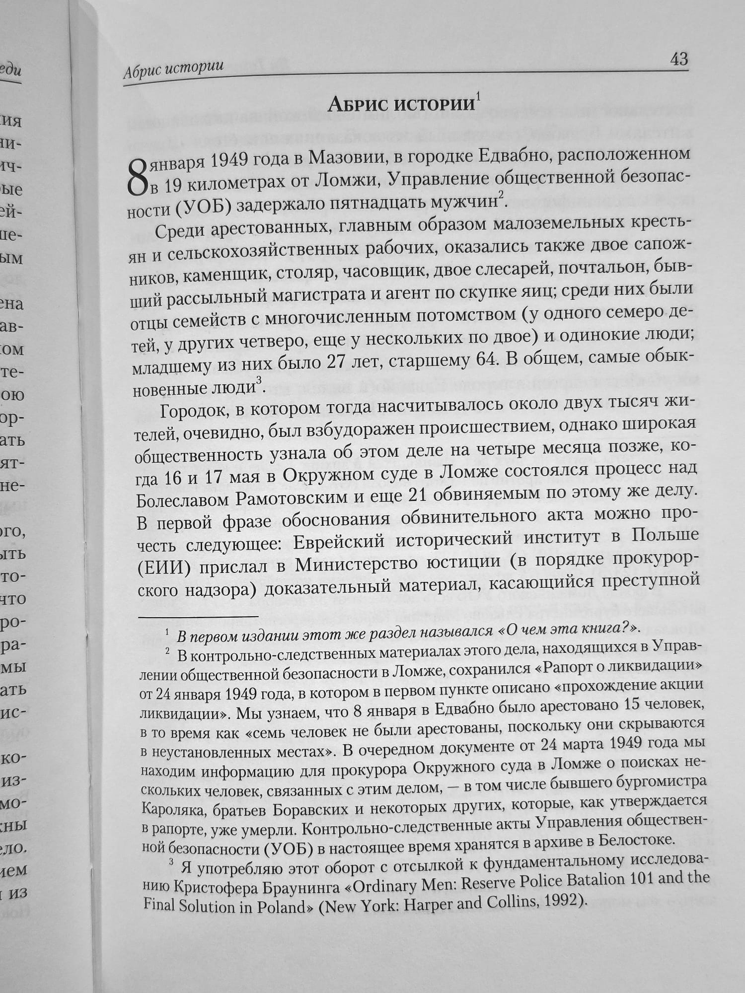 В начале июля 1941 года, в первые недели немецкой оккупации Восточной Польши, прокатились страшные еврейские погромы, учиненные не немцами, а поляками. Самый зверский погром случился 10 июля в городке Едвабно: его польские жители согнали в сарай и сожгли живьем сотни своих соседей-евреев. Долгие годы это событие оставалось прикрытым плотной двойной завесой — из молчания и умолчания. Эту завесу полностью сняла книга Яна Томаша Гросса «Соседи. История уничтожения еврейского местечка», вышедшая в мае 2000 года на польском языке.