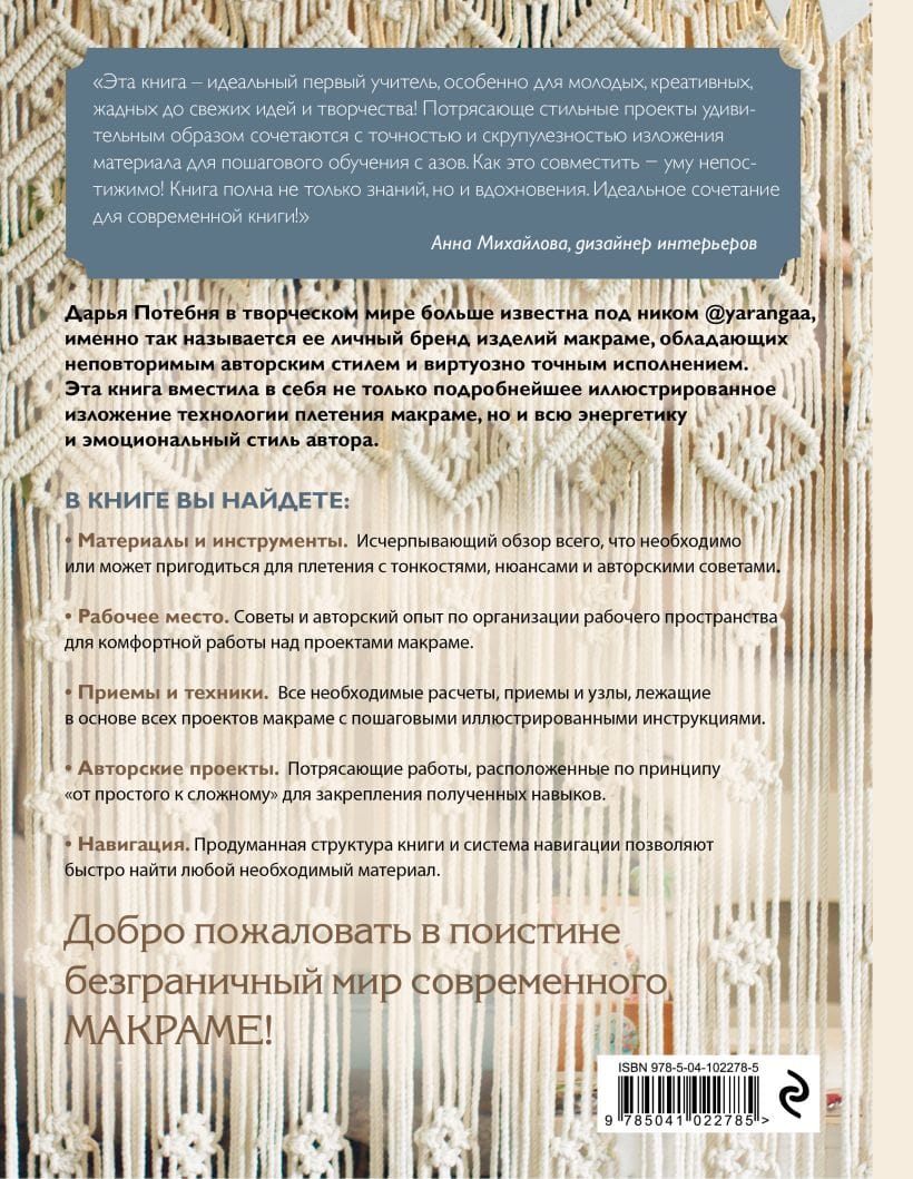 Занавески, панно, абажуры, сумки, украшения, да что угодно можно сплести, освоив основы техники макраме. В этом поможет эта подробная и красивая книга от известного мастера и блогера Дарьи Потебня, больше известной под ником @yarangaa! Узнаваемый стиль автора отразился на всей книге: легкий и образный язык, подробнейшие пошаговые иллюстрации, все основы техники и удивительные авторские работы, на примере которых вы будете осваивать азы мастерства. А в результате сможете научиться создавать удивительные вещи для интерьера или в подарок родным и близким.