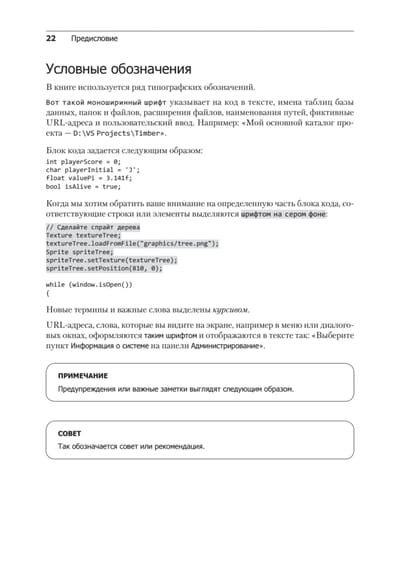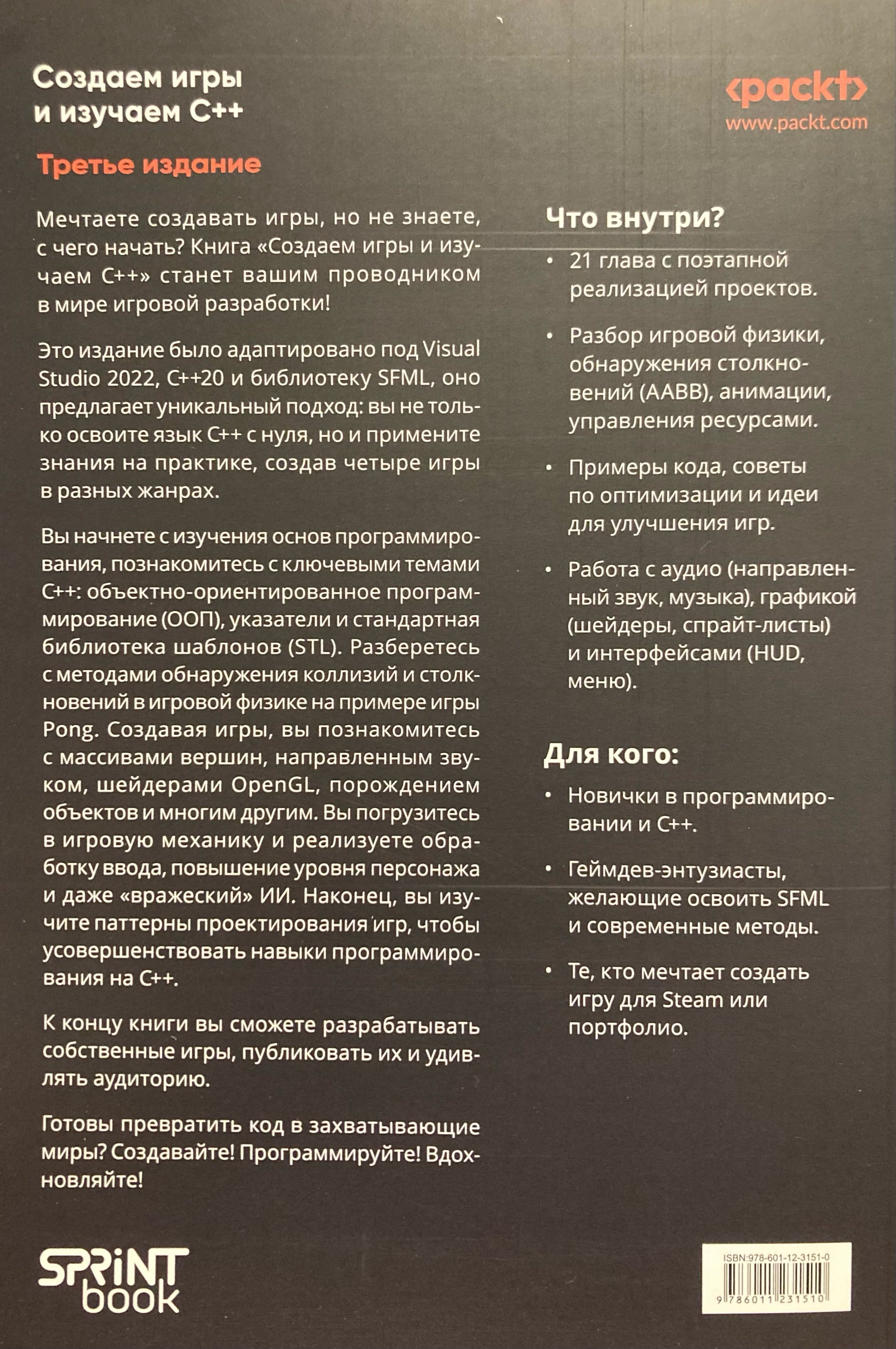Это издание было адаптировано под Visual Studio 2022, C++20 и библиотеку SFML, оно предлагает уникальный подход: вы не только освоите язык C++ с нуля, но и примените знания на практике, создав четыре игры в разных жанрах.