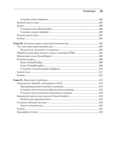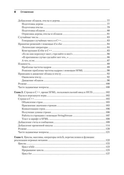 Вы начнете с изучения основ программирования, познакомитесь с ключевыми темами C++: объектно-ориентированное программирование (ООП), указатели и стандартная библиотека шаблонов (STL). Разберетесь с методами обнаружения коллизий и столкновений в игровой физике, на примере игры Pong. Создавая игры, вы познакомитесь с массивами вершин, направленным звуком, шейдерами OpenGL, порождением объектов и многим другим. Вы погрузитесь в игровую механику и реализуете обработку ввода, повышение уровня персонажа и даже «вражеский» ИИ. Наконец, вы изучите паттерны проектирования игр, чтобы усовершенствовать навыки программирования на C++.