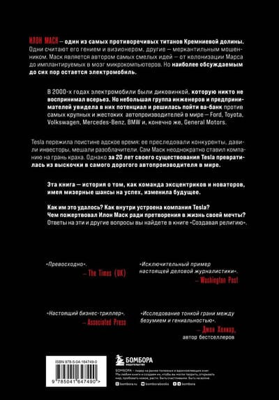 Илон Маск — один из самых противоречивых титанов Кремниевой долины. Одни считают его гением и визионером, другие — меркантильным мошенником. Маск является автором самых смелых идей, от колонизации Марса до имплантируемых в мозг микрокомпьютеров. Но наиболее обсуждаемым до сих пор остается электромобиль. В 2000-х годах они были диковинкой, которую никто не воспринимал всерьез. Но небольшая группа инженеров и предпринимателей увидела в них потенциал и решилась пойти ва-банк против самых крупных и жестоких бизнес-конкурентов в мире — Ford, Toyota, Volkswagen, Mercedes-Benz, BMW и, конечно же, General Motors. Tesla пережила поистине адское время: ее преследовали конкуренты, давили инвесторы, мешали разоблачители. Сам Маск неоднократно ставил компанию на грань краха. Однако за 20 лет своего существования Tesla превратилась из «выскочки» в самого дорогого автопроизводителя в мире. Эта книга — история о том, как команда эксцентриков и новаторов, имея мизерные шансы на успех, изменила будущее. Как им это удалось? Как внутри устроена компания Tesla? Чем пожертвовал Илон Маск ради претворения в жизнь своей мечты? Ответы на эти и другие вопросы вы найдете в книге «Игра ва-банк».