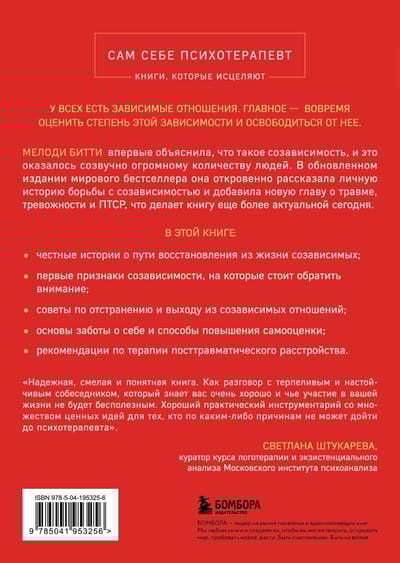 Если вы живете проблемами близкого человека, если постоянно стремитесь контролировать его жизнь, если чувствуете, что растворяетесь в другом, забыв о себе - значит, вы склонны к созависимости. И эта книга, ставшая международным бестселлером – для вас.  Мелоди Битти впервые популярно объяснила, что такое созависимость, и это оказалось созвучно огромному количеству людей. В книге вы найдете: пронзительные жизненные истории; признаки созависимости, которые помогут каждому оценить свою ситуацию; советы по преодолению зависимых отношений; рекомендации, как начать новую жизнь.