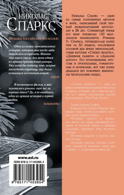 Тихий городок Бофор. Каждый год Лэндон Картер приезжает сюда, чтобы вспомнить историю своей первой любви… Историю страсти и нежности, много лет назад связавшей его, парня из богатой семьи, и Джейми Салливан, скромную дочь местного пастора. История радости и грусти, счастья и боли. Историю чувства, которое человеку доводится испытать лишь раз в жизни – и запомнить навсегда...