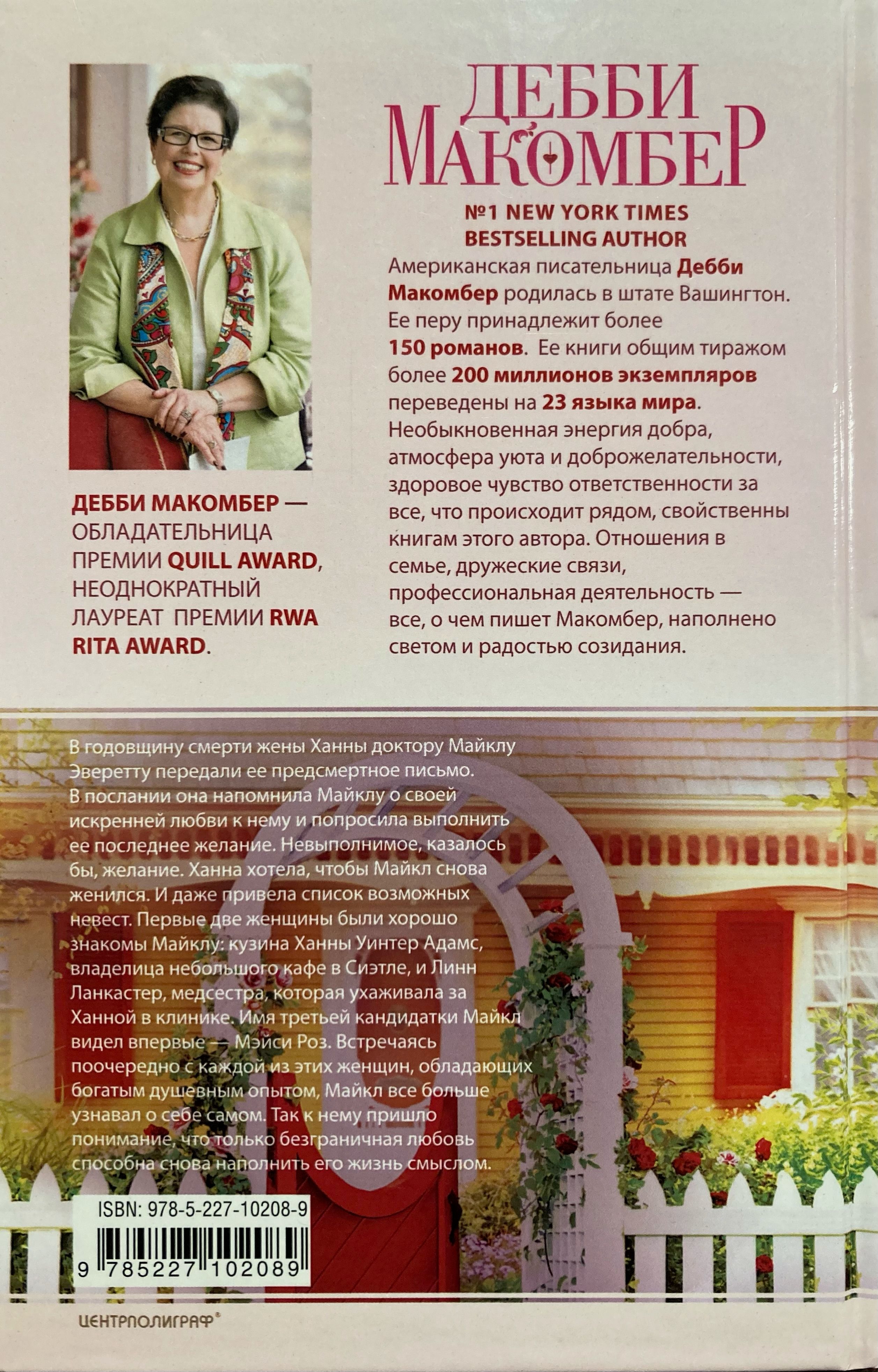 В годовщину смерти жены Ханны доктору Майклу Эверетту передали ее предсмертное письмо. В послании она напомнила Майклу о своей искренней любви к нему и попросила выполнить ее последнее желание. Невыполнимое, казалось бы, желание. Ханна хотела, чтобы Майкл снова женился. И даже привела список возможных невест. Первые две женщины были хорошо знакомы Майклу: кузина Ханны Уинтер Адамс, владелица небольшого кафе в Сиэтле, и Линн Ланкастер, медсестра, которая ухаживала за Ханной в клинике. Имя третьей кандидатки Майкл видел впервые — Мэйси Роз. Встречаясь поочередно с каждой из этих женщин, обладающих богатым душевным опытом, Майкл все больше узнавал и о себе самом. Так к нему пришло понимание, что только безграничная любовь способна снова наполнить его жизнь смыслом.