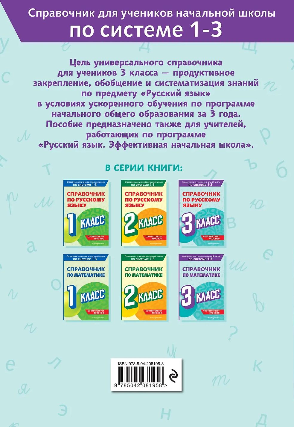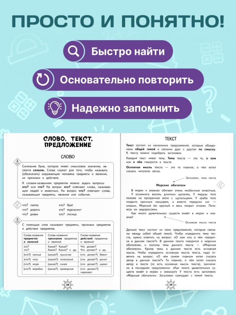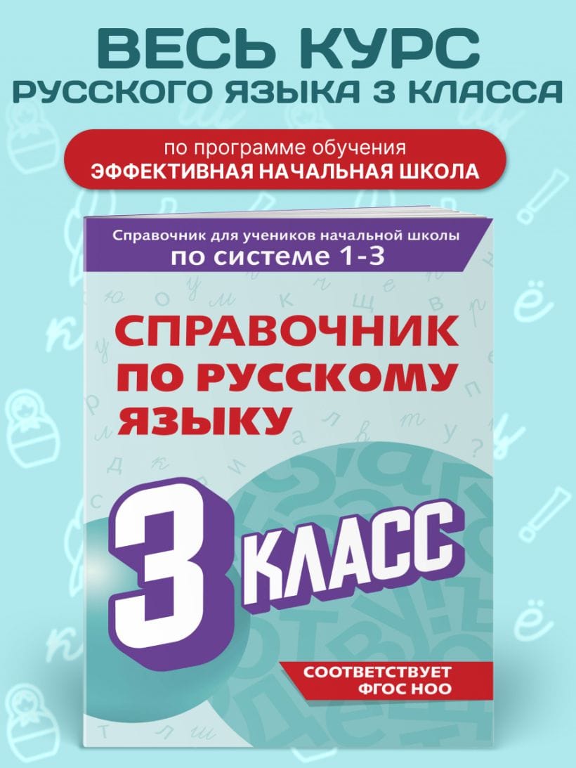Справочник предназначен для младших школьников, обучающихся по ускоренной трёхлетней программе или по индивидуальному плану, а также для преподавателей, работающих по программе «Эффективная начальная школа». Главное требование к справочникам для учеников начальных классов — краткое и понятное изложение учебного материала. В данном пособии предельно доступно, в виде таблиц, схем, правил и примеров их применения, изложен весь курс русского языка за 3 класс по программе трёхлетнего обучения. Такая подача материала позволяет быстро найти нужную учебную информацию, основательно повторить и надёжно запомнить её. Современное и удобное в использовании пособие разработано в полном соответствии с требованиями ФГОС начального общего образования.