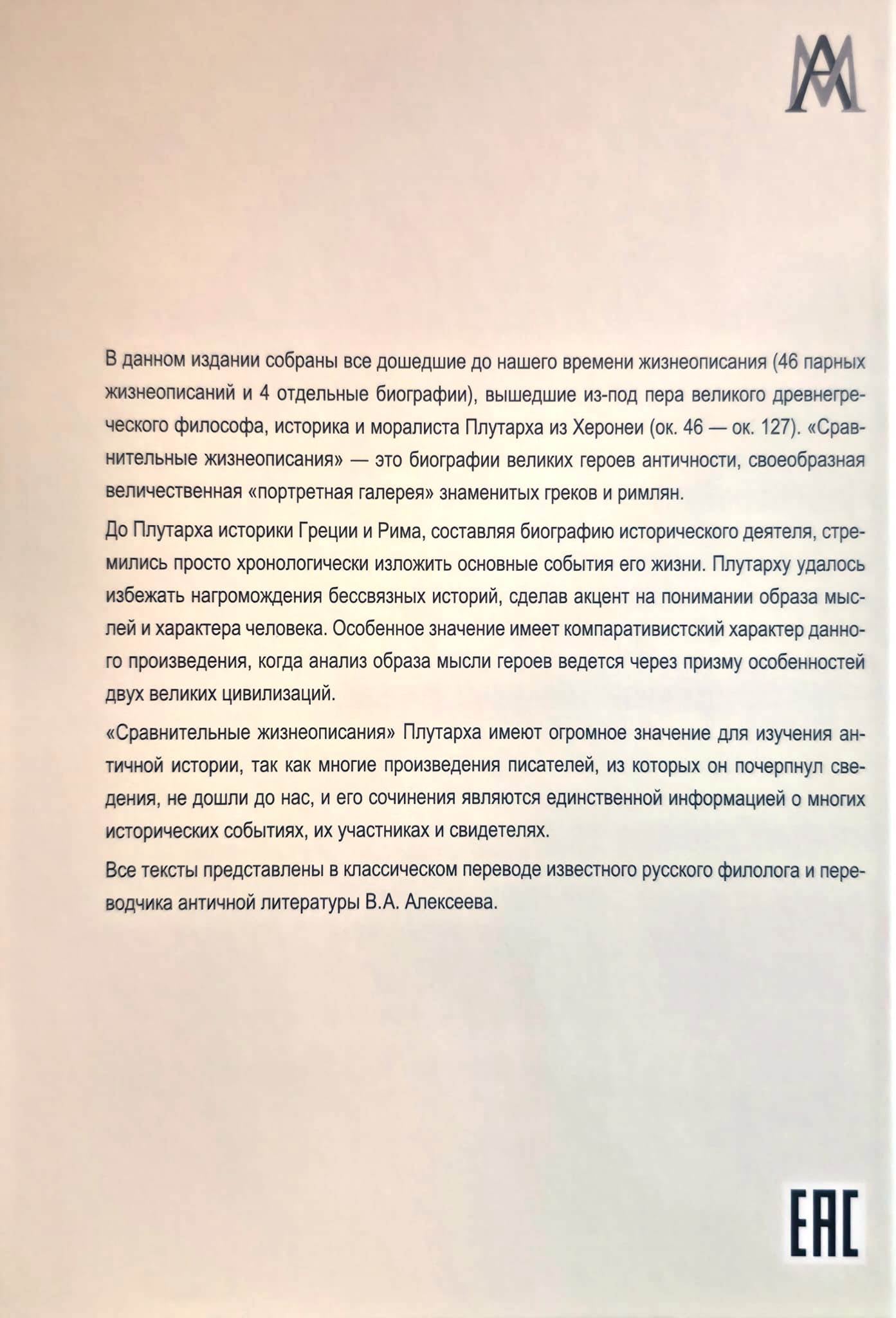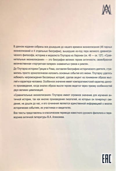 В данном издании собраны все дошедшие до нашего времени жизнеописания (46 парных жизнеописаний и 4 отдельные биографии), вышедшие из-под пера великого древнегреческого философа, историка и моралиста Плутарха из Херонеи (ок. 46 -ок. 127). «Сравнительные жизнеописания» — это биографии великих героев античности, своеобразная величественная «портретная галерея» знаменитых греков и римлян. До Плутарха историки Греции и Рима, составляя биографию исторического деятеля, стремились просто хронологически изложить основные события eго жизни. Плутарху удалось избежать нагромождения бессвязных историй, сделав акцент на понимании образа мыслей и характера человека. Особенное значение имеет компаративистский характер данного произведения, когда анализ образа мысли героев ведется через призму особенностей двух великих цивилизаций. «Сравнительные жизнеописания» Плутарха имеют огромное значение для изучения античной истории, так как многие произведения писателей, из которых он почерпнул сведения, не дошли до нас, и его сочинения являются единственной информацией о многих исторических событиях, участниках и свидетелях. Все тексты представлены в классическом переводе известного русского филолога и переводчика античной литературы В.А. Алексеева. Для студентов философских, политологических, исторических, филологических, культурологических специальностей и всех интересующихся историей Древнего мира.