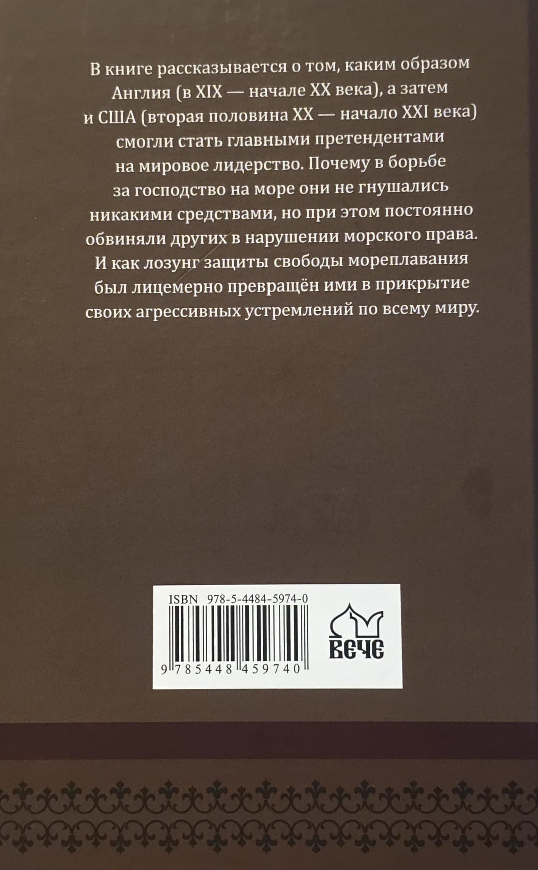 В книге рассказывается о том, каким образом Англия (в XIX — начале XX века), а затем и США (вторая половина XX — начало XXI века) смогли стать главными претендентами на мировое лидерство. Почему в борьбе за господство на море они не гнушались никакими средствами, но при этом постоянно обвиняли других в нарушении морского права. И как лозунг защиты свободы мореплавания был лицемерно превращён ими в прикрытие своих агрессивных устремлений по всему миру.