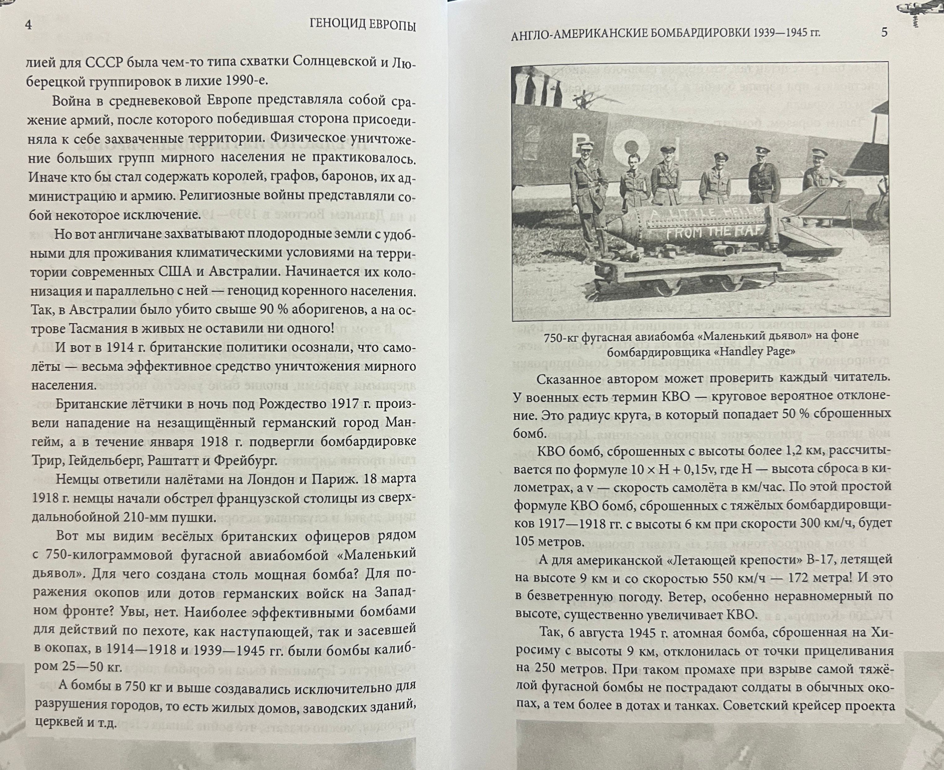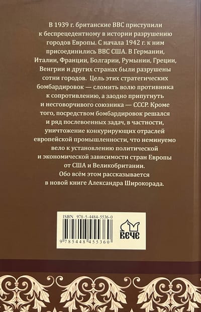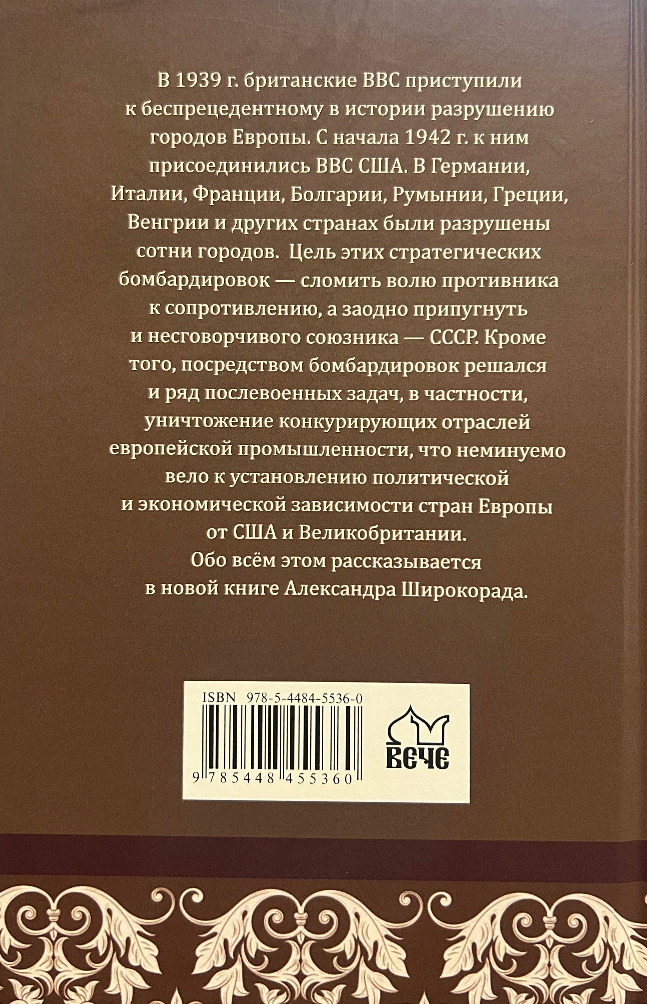 В 1939 г. британские ВВС приступили к беспрецедентному в истории разрушению городов Европы. С начала 1942 г. к ним присоединились ВВС США. В Германии, Италии, Франции, Болгарии, Румынии, Греции, Венгрии и других странах были разрушены сотни городов. Цель этих стратегических бомбардировок — сломить волю противника к сопротивлению, а заодно припугнуть и несговорчивого союзника — СССР. Кроме того, посредством бомбардировок решался и ряд послевоенных задач, в частности, уничтожение конкурирующих отраслей европейской промышленности, что неминуемо вело к установлению политической и экономической зависимости стран Европы от США и Великобритании.