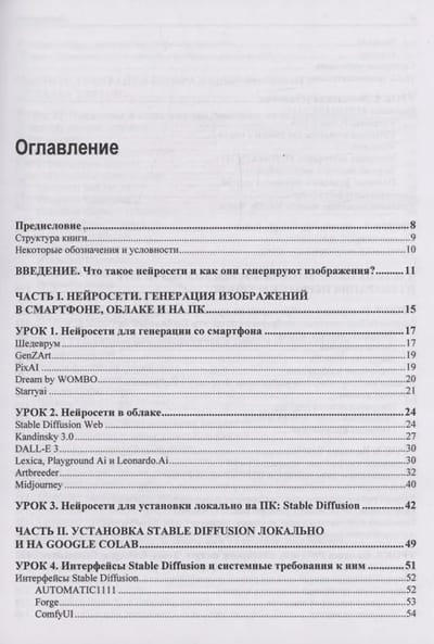 В книге представлено 22 проиллюстрированных урока по работе с нейросетью Stable Diffusion в интерфейсах AUTOMATIC1111 и Forge. Для лучшего усвоения материала разработаны сопровождающие книгу видеоуроки и сделан полный разбор всех моделей и препроцессоров ControlNet, доступный на электронном ресурсе Figma. Рассмотрены расширения ADetailer, Civitai Helper, State, A-person-mask-generator, Dynamic Prompts, Prompt All-in-One, SD-WebUI-AR-Plus, Photopea, FreeU, Reactor и ControlNet. Описаны основные функции и настройки, приведены примеры применения для генерации изображений. Рассказано, как управлять стилем и композицией через промты, настроить модели и препроцессоры ControlNet, автоматизировать генерации серий изображений с помощью расширений и скриптов, создавать реалистичные лица и другие изображения, использовать продвинутые трюки по ретуши и постобработке, интегрировать WebUI AUTOMATIC1111 и Forge в рабочие проекты.
