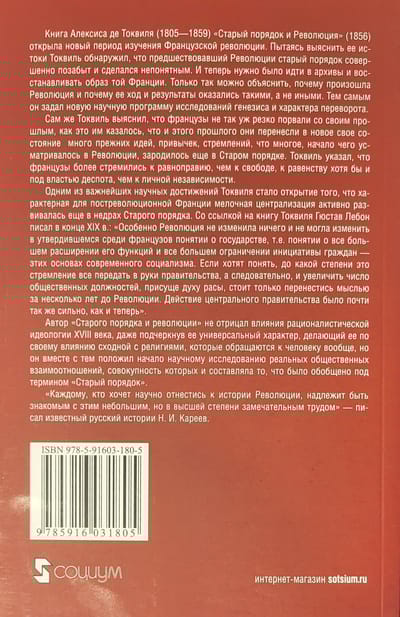 Книга Алексиса де Токвиля «Старый порядок и Революция» (1856) открыла новый период изучения Французской революции. Пытаясь выяснить ее истоки Токвиль обнаружил, что предшествовавший Революции старый порядок совершенно позабыт и сделался непонятным. И теперь нужно было идти в архивы и восстанавливать образ той Франции. Только так можно объяснить, почему произошла Революция и почему ее ход и результаты оказались такими, а не иными. Тем самым он задал новую научную программу исследований генезиса и характера переворота. Сам же Токвиль выяснил, что французы не так уж резко порвали со своим прошлым, как это им казалось, что и этого прошлого они перенесли в новое свое состояние много прежних идей, привычек, стремлений, что многое, начало чего усматривалось в Революции, зародилось еще в Старом порядке. Токвиль указал, что французы более стремились к равноправию, чем к свободе, к равенству хотя бы и под властью деспота, чем к личной независимости. В остальной Европе были, по сути, такие же порядки, как и в дореволюционной Франции, что и везде эти порядки падали, и что во Франции их ликвидация началась лишь раньше, чем в других местах.