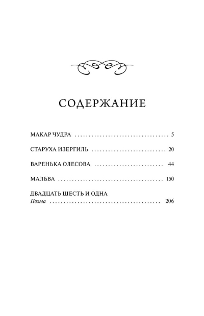 Кроме рассказа «Старуха Изергиль», где излагается знаменитая легенда о Данко и его горящем сердце, в сборник вошли тексты «Макар Чудра», «Варенька Олесова», «Мальва» и «Двадцать шесть и одна».