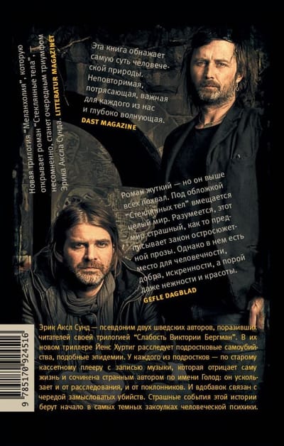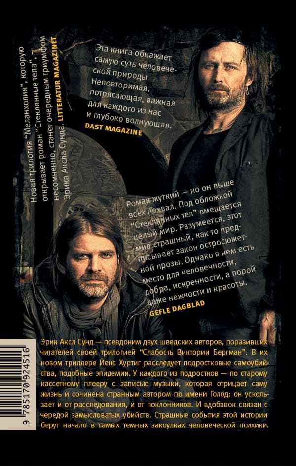Новую трилогию Эрика Аксла Сунда "Меланхолия" открывает остросюжетный роман "Стеклянные тела" (2014), в котором главный герой, комиссар Йенс Хуртиг расследует подростковые самоубийства, подобно эпидемии распространяющиеся по Швеции: в самых разных уголках страны подростки лишают себя жизни самыми жуткими способами. Их объединяет лишь одна деталь: у каждого из них находят по старому кассетному плееру с записями музыки, от которой стынет кровь даже у полиции. Автор этой музыки — некто по имени Голод, неуловимый и таинственный, на которого безуспешно пытаются выйти как следователи, так и поклонники-меломаны.   Но уже скоро Йенс Хуртиг понимает, что самоубийства подростков самым невероятным образом связаны с чередой убийств влиятельных людей... На первый взгляд разрозненные детали сплетаются в клубок, распутать который пытаются герои романа, каждый по-своему.