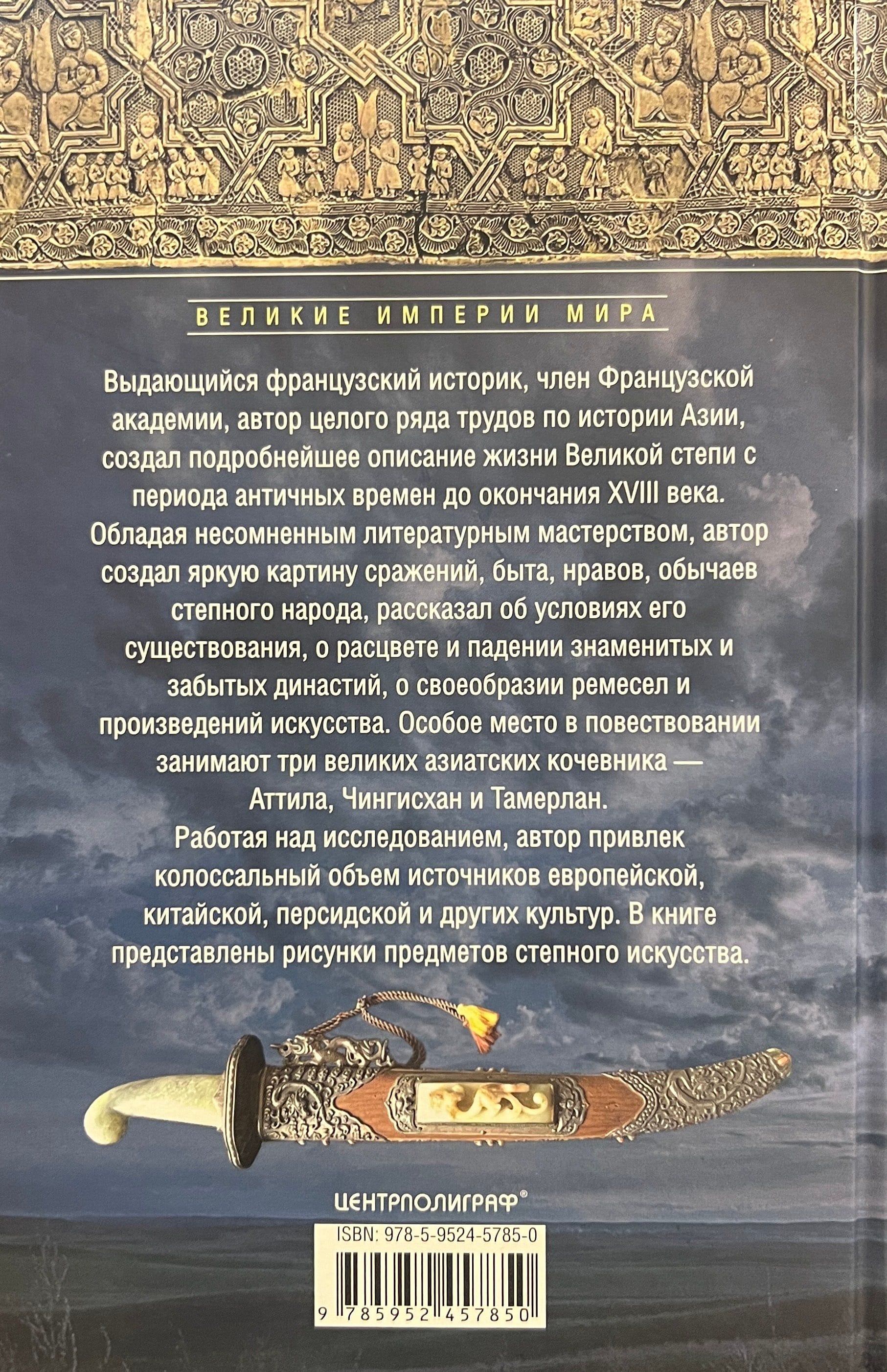 Выдающийся французский историк, член Французской академии, автор целого ряда трудов по истории Азии, создал подробнейшее описание жизни Великой степи с периода античных времен до окончания XVIII века. Обладая несомненным литературным мастерством, автор создал яркую картину сражений, быта, нравов, обычаев степного народа, рассказал об условиях его существования, о расцвете и падении знаменитых и забытых династий, о своеобразии ремесел и произведений искусства. Особое место в повествовании занимают три великих азиатских кочевника — Аттила, Чингисхан и Тамерлан.