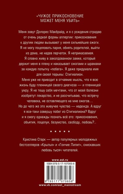 Меня зовут Долорес Макбрайд, и я с рождения страдаю от очень редкой формы аллергии: прикосновения к другим людям вызывают у меня сильнейшие ожоги. Я не могу поцеловать парня, обнять родителей, выйти из дому, не надев перчатки. Я неприкасаемая. Я словно живу в заколдованном замке, который держит меня в плену и наказывает ожогами и шрамами за каждую попытку «побега». Даже придумала имя для своей тюрьмы: Стигмалион.