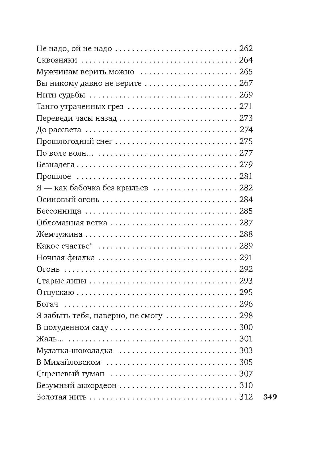 Лариса Рубальская — известный поэт-песенник. Многие песни на ее стихи стали золотыми шлягерами в исполнении самых ярких звезд российской эстрады — Аллы Пугачевой, Валерия Леонтьева, Ирины Аллегровой, Александра Малинина, Михаила Муромова, Филиппа Киркорова и других популярных артистов. В сборник вошли избранные стихотворения разных лет, в том числе положенные на музыку: «Странная женщина», «Напрасные слова», «Угонщица», «Сокольники», «Доченька», «Виноват я, виноват», «Переведи часы назад» и др. О песнях, снискавших всенародную любовь, сама поэтесса говорит так: «Эти песни объективно хорошие, а не случайно раскрученные. В них не вложены деньги, связи, они живут сами по себе… К тому же песни выбраны хорошими артистами, поэтому их жизнь оказалась длинной. Она зависит еще от того, стал ли ретро сам автор». В чем творческий секрет Ларисы Рубальской, ее неувядающего успеха? Пожалуй, в том, что в стихах она ведет доверительный разговор о жизни, времени и любви; иногда в нем чувствуется грусть, иногда ирония, но он неизменно проникнут надеждой на лучшее и верой в добро.