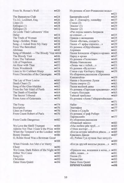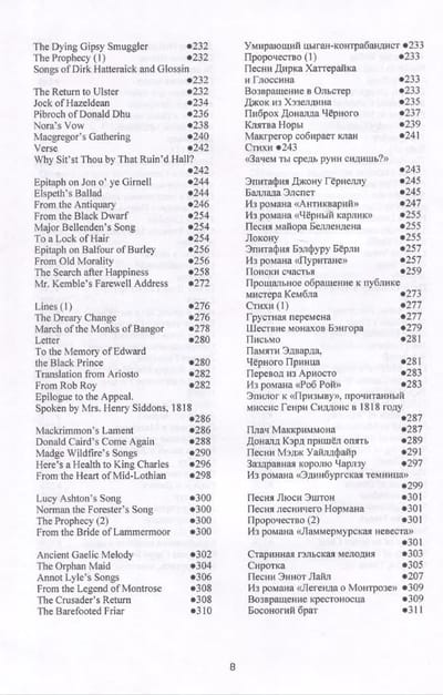 Лучшие из стихов Скотта отличают сюжетность, яркость образов, отточенная форма. Поэт выражает в них любовь к суровой шотландской природе, уважение к труженикам, восхищение героями родного края. Подробные примечания помогают лучше понять особенности и дух далекой от нас эпохи.
