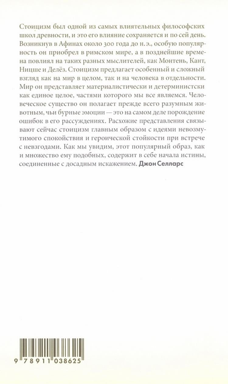 Краткое введение в философию стоицизма, написанное английским антиковедом и историком философии Джоном Селларсом. Книга последовательно излагает историю стоической мысли, а также описывает ее влияние на дальнейшую европейскую философию и культуру. Селларс формулирует философские доктрины школы, поочередно рассматривая каждый раздел стоической теории (логики, физики, этики) и соответствующие философские категории. Издание включает в себя глоссарий имен и терминов, хронологический указатель и обширную библиографию.