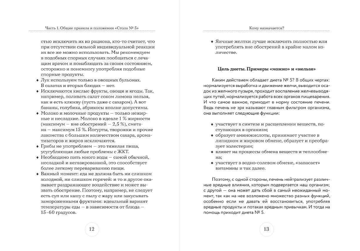 Что важно для всех читающих эту книгу. «Стол № 5» — довольно общее понятие. В него входят два основных раздела — «собственно стол № 5», который рекомендуют при заболеваниях печени, желчного пузыря, желчевыводящих путей и панкреатите вне стадии обострения, и «стол № 5а», который прописывают при хроническом панкреатите. Так как заболеваний печени и сопутствующих органов на свете существует много, нужно обязательно посоветоваться со своим лечащим врачом — какой именно вариант он вам посоветует и на какие блюда при составлении диеты обратить особое внимание. В этой книге вы найдете список продуктов, которые можно и которые нельзя употреблять при определенных заболеваниях, рекомендации по их обработке и нарезке. «Стол № 5» подразумевает частое питание небольшими порциями. Обычно назначают 5 приемов пищи в день, из которых два или три могут состоять только из одного блюда. Поэтому в книге дано меню на 4 недели, созданное из блюд, представленных в ней. А также приведена таблица по КБЖУ каждого важного продукта. И, конечно, рецепты, их более ста. Надеемся, книга станет полезным помощником тем людям, у которых уже есть проблемы со здоровьем, а также тем, кто хочет оставаться здоровым как можно дольше.