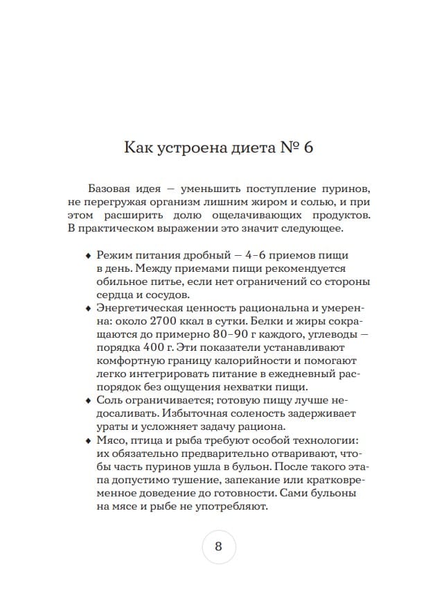 Диета № 6 подходит и в период стойкой ремиссии, и в фазах вне обострения, а при необходимости врач корректирует жесткость ограничений. Наша книга помогает организовать повседневное питание в рамках назначенных ориентиров. Важное правило: сначала отварить продукты. Это технологическое правило позволяет снизить нагрузку без радикального отказа от животного белка. После такого шага продукт можно запекать, тушить или аккуратно доводить до готовности. Сами бульоны не используют. Овощи, молоко, ряд фруктов и щелочные минеральные воды помогают поддерживать нужную реакцию мочи и способствуют выведению уратов. Отсюда — акцент на овощных гарнирах и супах, на молочных напитках и киселях, на достаточном питье в течение суток. Для питьевого режима выбраны средства с доказанной пользой: вода, некрепкий чай, компоты без избытка сахара, отвары шиповника и отрубей, щелочные минеральные воды. Такой набор работает на общую цель диеты, не перегружая обмен.