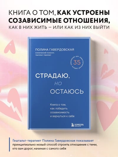Полина Гавердовская, гештальт-терапевт и ведущий тренер Московского Гештальт Института, написала книгу для всех, кто находится в созависимых отношениях. Это книга о том, как открыть принципиально новый способ строить отношения с теми, кто вам дорог. Начиная с самого себя.