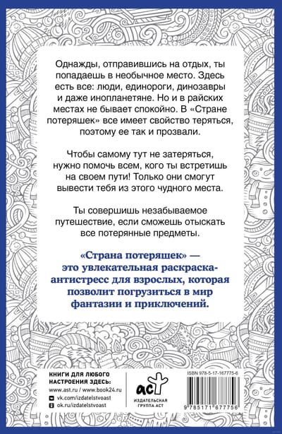 «Страна потеряшек» — это увлекательная раскраска-антистресс для взрослых, которая позволит погрузиться в мир фантазии и приключений.