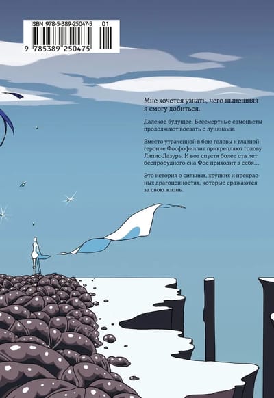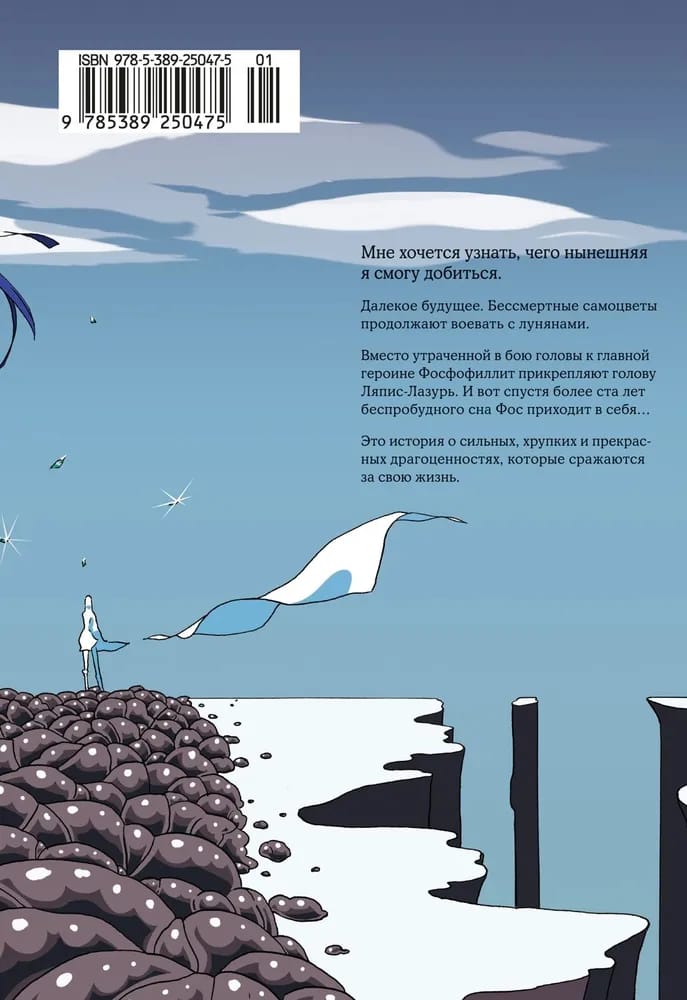 Вместо утраченной в бою головы к главной героине Фосфофиллит прикрепляют голову Ляпис-Лазурь. И вот спустя более ста лет беспробудного сна Фос приходит в себя… Это история о сильных, хрупких и прекрасных драгоценностях, которые сражаются за свою жизнь.