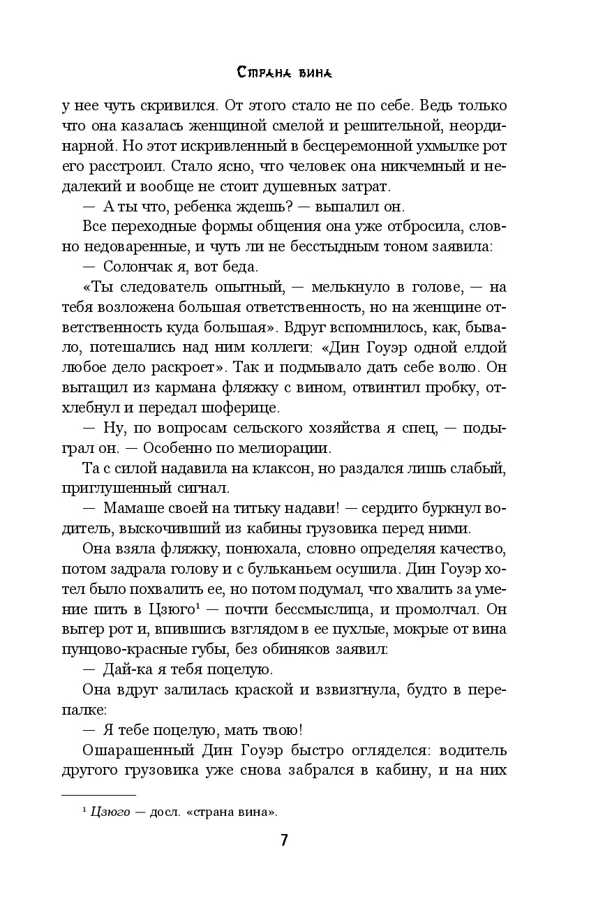 Уже давно ходят жуткие слухи, что в провинции Цзюго (что буквально означает «Страна вина») творится неслыханное — поедают детей. На следователя по особо важным делам провинциальной прокуратуры Дин Гоуэра была возложена ответственная миссия — докопаться до правды. В честь приезда следователя в провинции закатывают грандиозный пир, который станет началом того тяжелого алкогольного ступора, который опустится, кажется, на весь окружающий мир. Вас ждет еще одно фантасмагоричное путешествие в самое сердце Китая.